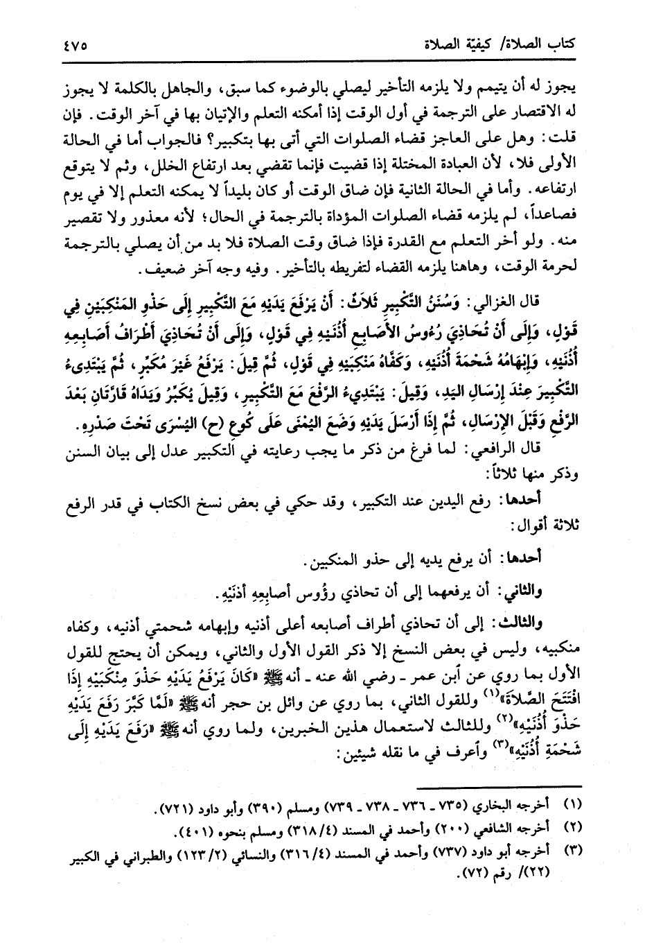 قال الغزالي: وَسُنَنُ التَّكْبِيرِ ثَلاَثٌ: أَنْ يَرْفَعَ يَدَيْهِ مَعَ التَّكْبِيرِ إلَى حَذوِ المَنْكِبَيْنِ فِي قَوْلٍ، وَإِلَى أَنْ تُحَاذِيَ رُءُوسُ الأَصَابِعِ أُذُنَيهِ فِي قَوْلٍ، وَإِلَى أَن تُحَاذِيَ أَطْرَافُ أَصَابِعِهِ أُذُنَيهِ، وَإبْهَامُهُ شَحْمَةَ أُذُنَيْهِ، وَكَفَّاهُ مَنْكبَيْهِ فِي قَوْلٍ، ثُمَّ قِيلَ: يَرْفَعُ غَيْرَ مُكَبِّرٍ، ثُمَّ يَبْتَدِئُ التَّكْبِيرَ عِنْدَ إِرْسَالِ اليَدِ، وَقِيلَ: يَبْتَدِيءُ الرَّفْعَ مَعَ التَّكْبِيرِ، وَقِيلَ يُكَبِّرُ وَيَدَاهُ قَارَّتَانِ بَعْدَ الرَّفْعِ وَقَبْلَ الإِرْسَالِ، ثُمَّ إذَا أَرْسَلَ يَدَيْهِ وَضَعَ اليُمْنَى عَلَى كُوعِ (ح) اليُسْرَى تَحْتَ صَدْرِهِ.