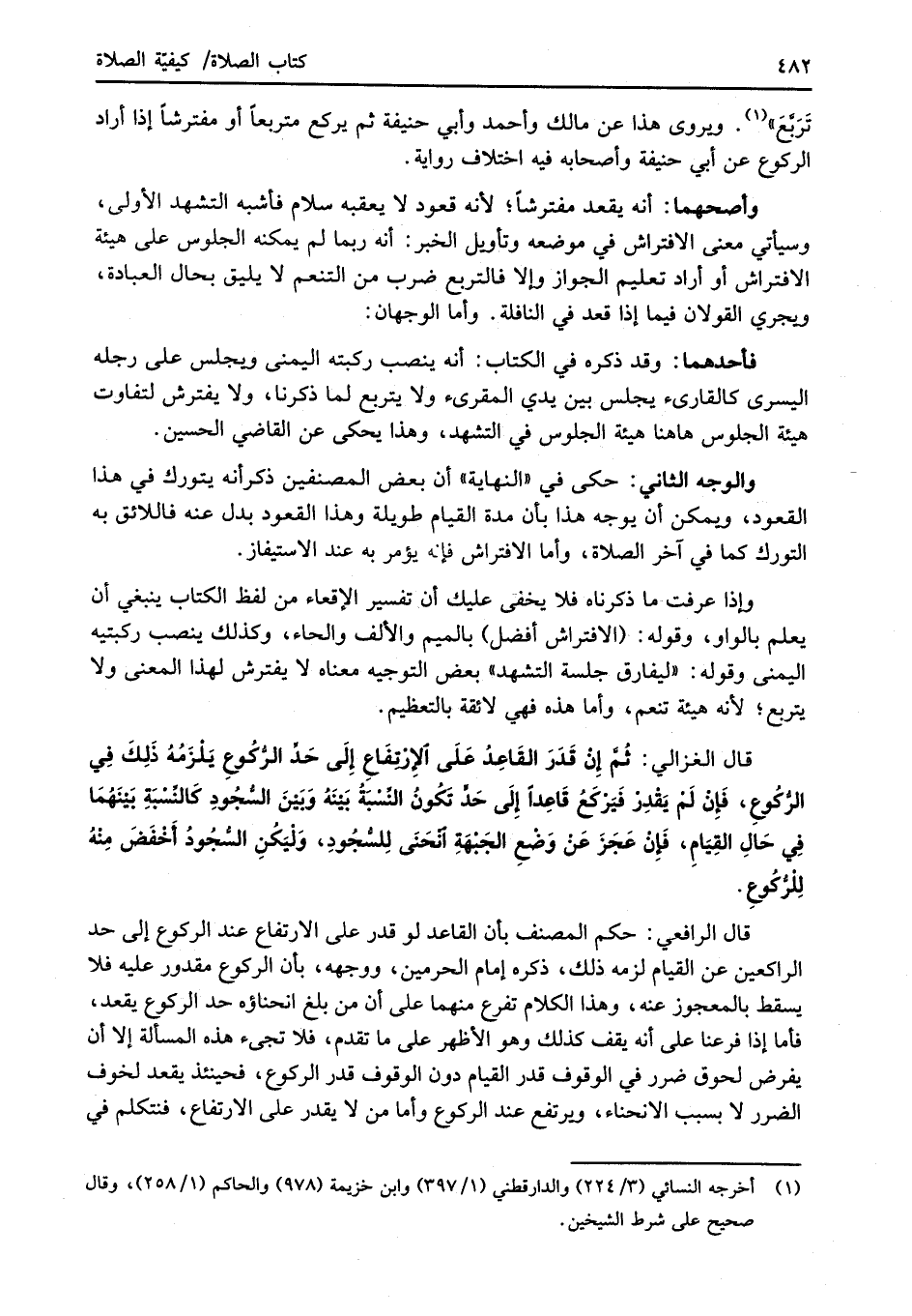 قال الغزالي: ثُمَّ إِنْ قَدَرَ القَاعِدُ عَلَى الإرْتفَاعِ إِلَى حَدِّ الرُّكُوعِ يَلْزَمُهُ ذَلِكَ فِي الرُّكُوعِ، فَإِنْ لَمْ يَقْدِر فَيَرْكَعُ قَاعِدًا إِلَى حَدٍّ تَكُونُ النِّسْبَةُ بَيْنَهُ وَبَيْنَ السُّجُودِ كَالنِّسْبَةِ بَيْنَهُمَا فِي حَالِ القِيَامِ، فَإِنْ عَجَزَ عَنْ وَضْعِ الجَبْهَةِ انْحَنَى لِلسُّجُودِ، وَلْيَكُنِ السُّجُودُ أَخْفَضَ مِنْهُ لِلْرُّكُوعِ.
