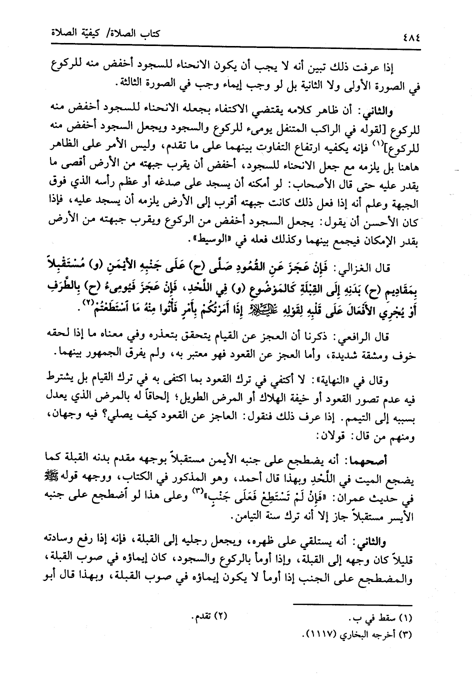 قال الغزالي: فَإِنْ عَجَزَ عَنِ القُعُودِ صَلَّى (ح) عَلَى جَنْبِهِ الأيْمَنِ (و) مُسْتَقْبِلاً بِمَقَادِيم (ح) بَدَنِهِ إِلَى القِبْلَةِ كالمَوْضُوعِ (و) فِي اللَّحْدِ، فَإِنْ عَجَزَ فَيُومِئُ (ح) بِالطَّرَفِ أَوْ يُجْرِي الأَفْعَالَ عَلَى قَلْبِهِ لِقَوْلهِ عليه السلام إِذَا أَمَرْتُكُم بِأمْرٍ فَأْتُوا مِنْهُ مَا اسْتَطَعْتُمْ (¬2).