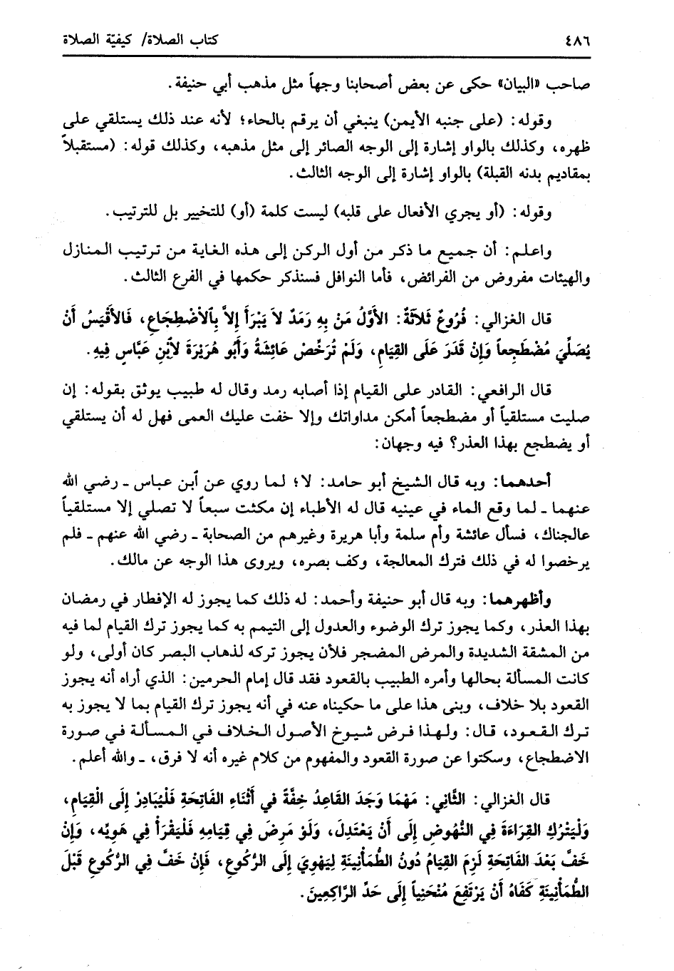 قال الغزالي: فرُوعٌ ثَلاثَةٌ: الأَوَّلُ مَنْ بِهِ رَمَدٌ لاَ يَبْرَأَ إلاَّ بِالاضْطِجَاعِ، فَالأَقْيَسُ أَنْ يُصَلِّيَ مُضْطَجِعاً وَإِنْ قَدرَ عَلَى القِيَامِ، وَلَمْ تُرَخِّصْ عَائِشَةُ وَأَبُو هُرَيْرَةَ لابْنِ عَباَّسٍ فِيهِ.
