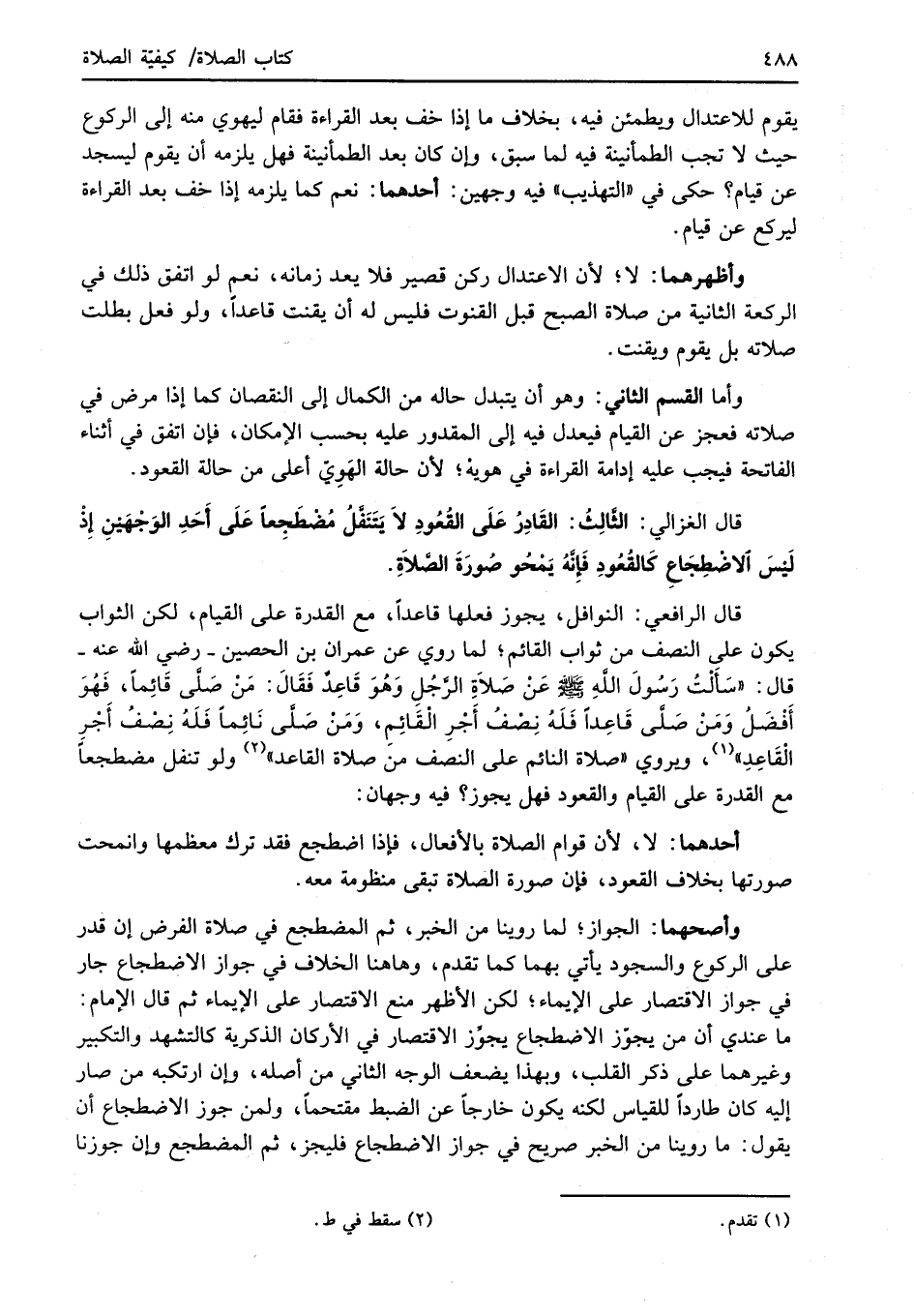 قال الغزالي: الثَّالِثُ: القَادِرُ عَلَى القُعُودِ لاَ يَتَنَفَّلُ مُضْطَجِعاً عَلَى أَحَدِ الوَجْهَيْنِ إِذْ لَيْسَ الاضْطِجَاعِ كالقُعُودِ فَإِنَّهُ يَمْحُو صُورَةَ الصَّلاَةِ.