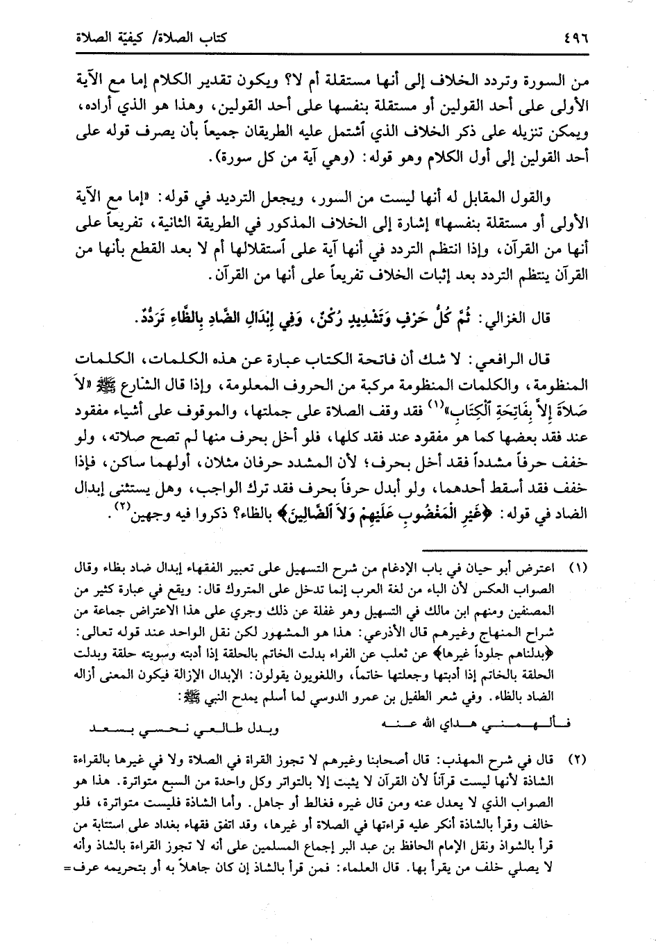 قال الغزالي: ثُمَّ كُلُّ حَرْفٍ وَتَشْدِيدٍ رُكْنٌ، وَفِي إِبْدَالِ الضَّادِ بِالظَّاءِ تَرَدُّدٌ.