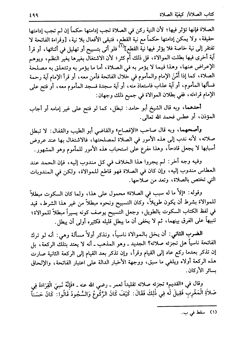 وقوله: "إلاَّ ما له سبب في الصلاة" محمول على هذا، ولما كان السكوت مبطلاً للموالاة بشرط أن يكون طويلاً، وكان التسبيح ونحوه مبطلاً من غير هذا الشرط، قيد في لفظ الكتاب السكوت بالطويل، وجعل التسبيح يوصف كونه يسيراً مبطلاً للموالاة؛ تنبيهًا على الفرق بينهما، ثم لا يخفى أن ما يبطل قليله فكثيره أولى أن يبطل.