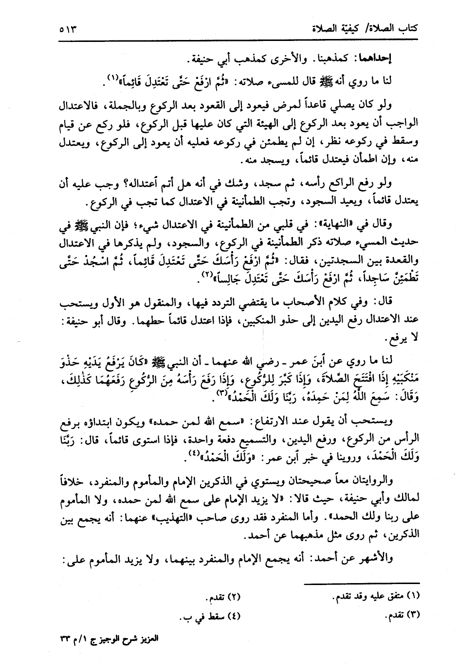 وقال في "النهاية": في قلبي من الطمأنينة في الاعتدال شيء؛ فإن النبي -صلى الله عليه وسلم- في حديث المسيء صلاته ذكر الطمأنينة في الركوع، والسجود، ولم يذكرها في الاعتدال والقعدة بين السجدتين، فقال: "ثُمَّ ارْفَعْ رَأْسَكَ حَتَّى تَعْتَدِلَ قَائِمًا، ثُمَّ اسْجُدْ حَتَّى تَطْمَئِنَّ سَاجِداً، ثُمَّ ارْفَعْ رَأْسَكَ حَتَّى تَعْتَدِلَ جَالِساً" (¬2).