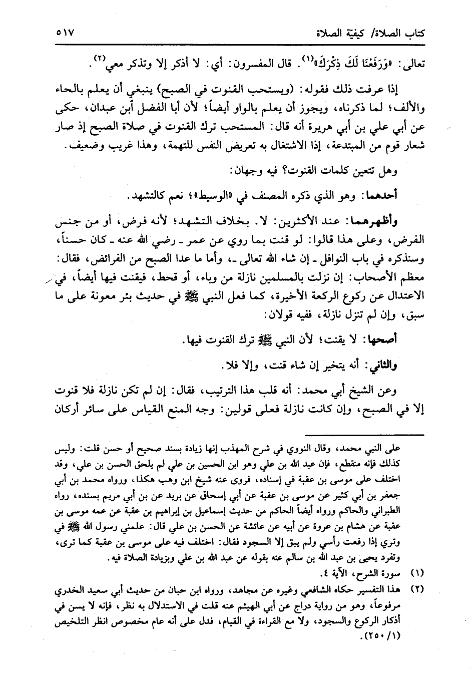 إذا عرفت ذلك فقوله: (ويستحب القنوت في الصبح) ينبغي أن يعلم بالحاء والألف؛ لما ذكرناه، ويجوز أن يعلم بالواو أيضاً؛ لأن أبا الفضل ابن عبدان، حكى عن أبي علي بن أبي هريرة أنه قال: المستحب ترك القنوت في صلاة الصبح إذ صار شعار قوم من المبتدعة، إذا الاشتغال به تعريض النفس للتهمة، وهذا غريب وضعيف.