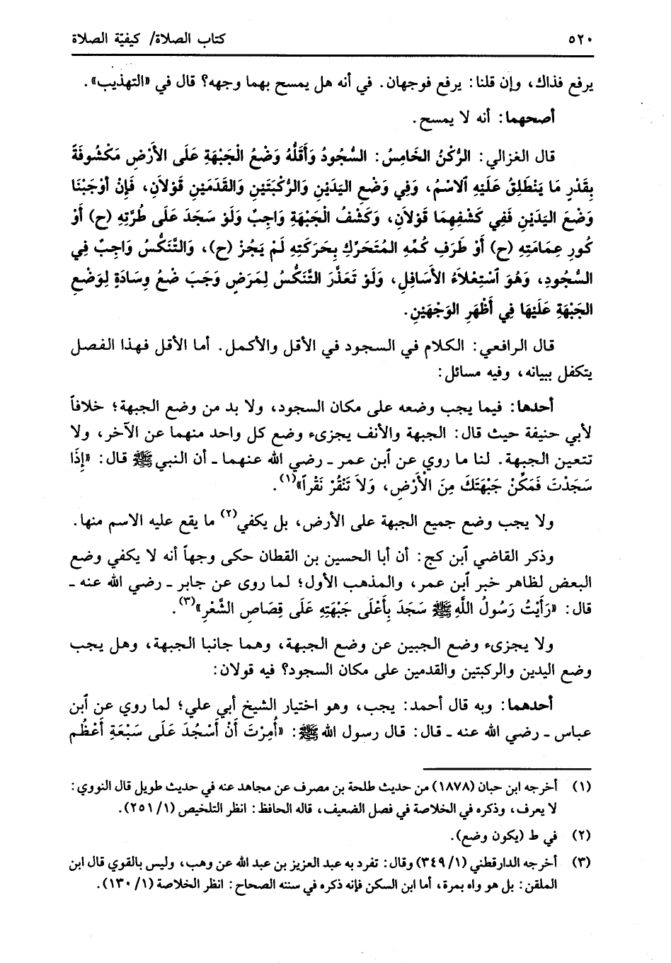 قال الغزالي: الرُّكْنُ الخَامِسُ: السُّجُودُ وَأَقَلُّهُ وَضْعُ الْجَبْهَةِ عَلَى الأَرْضِ مَكْشُوفَةً بِقَدْر مَا يَنْطَلِقُ عَلَيْهِ الاسْمُ، وَفِي وَضْعِ اليَدَيْنِ وَالرُّكْبَتَيْنِ وَالقَدَمَيْنِ قَوْلاَنِ، فَإِنْ أوْجَبْنَا وَضْعَ اليَدَيْنِ فَفِي كَشْفِهِمَا قَوْلاَنِ، وَكَشْفُ الْجَبْهَةِ وَاجِبٌ وَلَوْ سَجَدَ عَلَى طُرَّتِهِ (ح) أَوْ كُورِ عِمَامَتِهِ (ح) أَوْ طَرَفِ كُمِّهِ المُتَحَرِّكِ بحَرَكتِهِ لَمْ يَجُزْ (ح)، وَالتَّنَكُّسُ وَاجِبٌ فِي السُّجُودِ، وَهُوَ اسْتِعْلاَءُ الأَسَافِلِ، وَلَوْ تَعَذَّرَ التَّنَكُّسُ لِمَرَضٍ وَجَبَ وضْعُ وِسَادَةٍ لِوَضْعِ الجَبْهَةِ علَيْهَا فِي أَظْهَرِ الوَجْهَيْنِ.