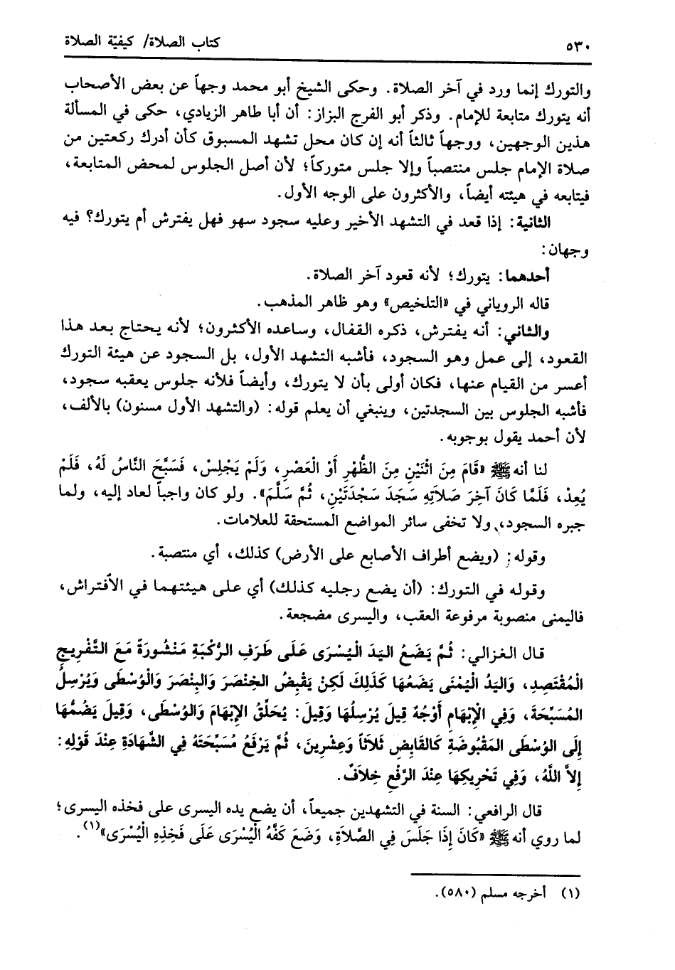 قال الغزالي: ثُمَّ يَضَعُ اليَدَ الْيُسْرَى عَلَى طَرَفِ الرُّكْبَةِ مَنْشُورَةً مَعَ التَّفْرِيجِ الْمُقْتَصِدِ، وَاليَدُ اليُمْنَى يَضَعُهَا كَذلِكَ لَكِنْ يَقْبِضُ الخِنْصَرَ وَالبِنْصَرَ وَالْوُسْطَى وَيُرْسِلُ المُسَبِّحَةَ، وَفِي الإِبْهَامِ أَوْجُهٌ قِيلَ يُرْسِلُهَا وَقِيلَ: يُحَلِّقُ الإِبْهَامَ وَالوُسْطَى، وَقِيلَ يَضُمُّهَا إلَى الوُسْطَى المَقْبُوضَةِ كَالقَابِضِ ثَلاَثاً وَعِشْرِينَ، ثُمَّ يَرْفعُ مُسَبِّحَتَهُ فِي الشَّهَادَةِ عِنْدَ قَوْلِهِ: اِلاَّ الله، وَفِي تَحْرِيكِهَا عِنْدَ الرَّفْعِ خِلاَفٌ.