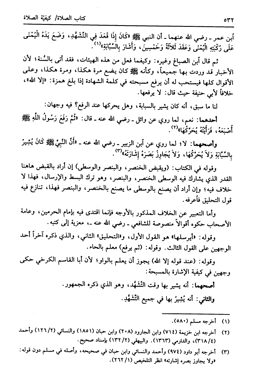 ابن عمر -رضي الله عنهما- أن النبي -صلى الله عليه وسلم- "كَانَ إِذَا قَعَدَ فِي التَّشَهُّدِ، وَضَعَ يَدَهُ الْيُمْنَى عَلَى رُكْبَتِهِ الْيُمْنَى وَعَقَدَ ثَلاثَةً وَخَمْسِينَ، وَأَشَارَ بِالسَّبَّابَةِ" (¬1).