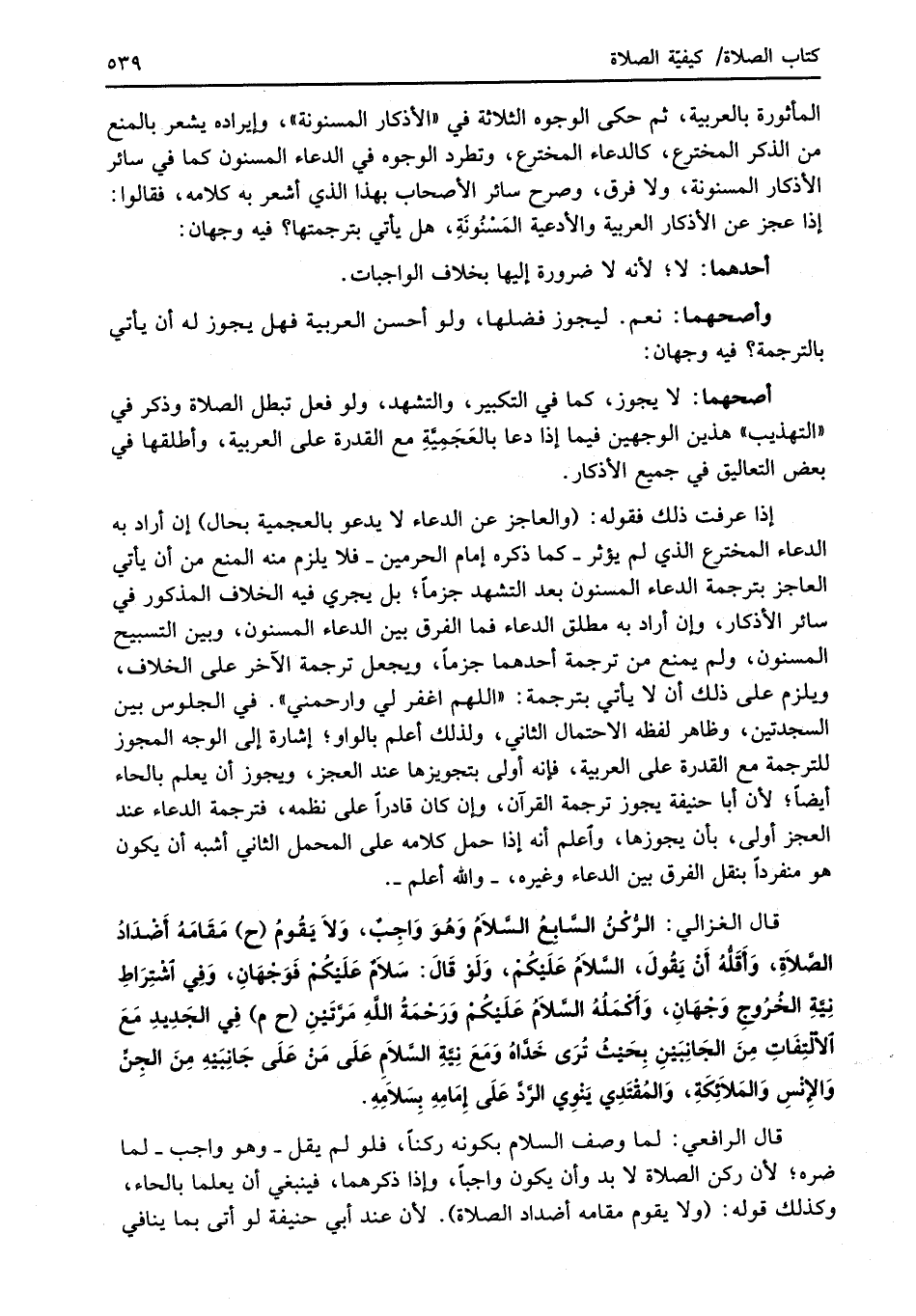 قال الغزالي: الرُّكْنُ السَّابِعُ السَّلاَمُ وَهُوَ وَاجِبٌ، وَلاَ يَقُومُ (ح) مَقَامَهُ أَضْدَادُ الصَّلاَةِ، وَأَقَلُّهُ أَنْ يَقُولَ، السَّلاَمُ عَلَيْكُمْ، وَلَو قَالَ: سَلاَمٌ عَلَيْكُمْ فَوَجْهَانِ، وَفِي اشْتِرَاطِ نِيَّةِ الخُرُوجِ وَجْهَانِ، وَأكْمَلُهُ السَّلاَمُ عَلَيْكُمْ وَرَحْمَةُ اللهِ مَرَّتَيْنِ (ح م) فِي الجَدِيدِ مَعَ الالْتِفَاتِ مِنَ الجَانِبَيْنِ بِحَيْثُ تُرَى خَدَّاهُ وَمَعَ نِيَّةِ السَّلاَمِ عَلَى مَنْ عَلَى جَانِبَيْهِ مِنَ الجِنِّ وَالإنْسِ وَالمَلاَئِكَةِ، وَالمُقْتَدِي يَنْوِي الرَّدَّ عَلَى إِمَامِهِ بِسَلاَمِهِ.