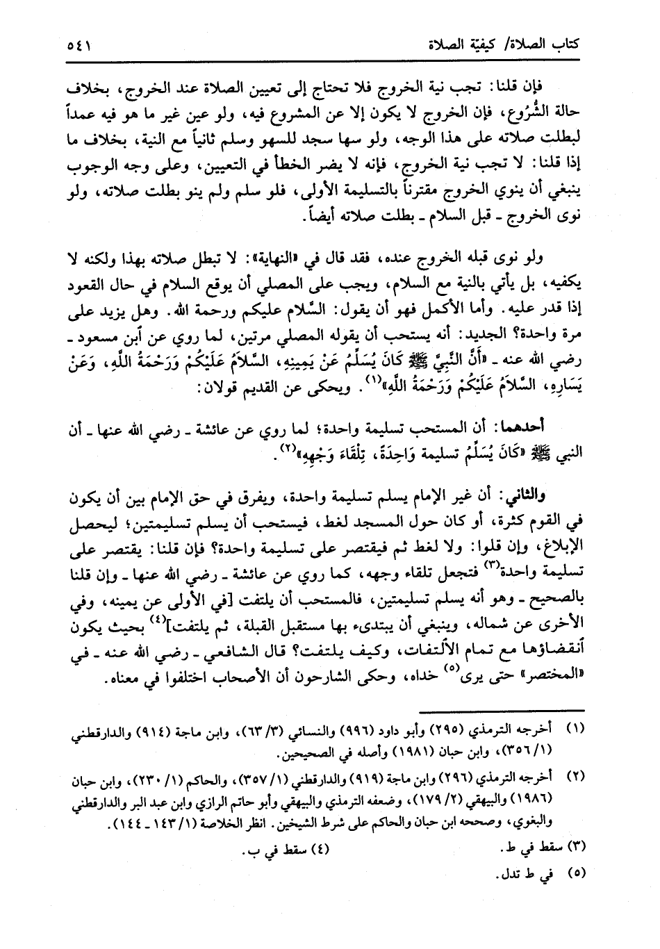 ولو نوى قبله الخروج عنده، فقد قال في "النهاية": لا تبطل صلاته بهذا ولكنه لا يكفيه، بل يأتي بالنية مع السلام، ويجب على المصلي أن يوقع السلام في حال القعود إذا قدر عليه. وأما الأكمل فهو أن يقول: الكلام عليكم ورحمة الله. وهل يزيد على مرة واحدة؟ الجديد: أنه يستحب أن يقوله المصلي مرتين، لما روي عن ابن مسعود -رضي الله عنه- "أَنَّ النَّبِيَّ -صلى الله عليه وسلم- كَانَ يُسَلِّمْ عَنْ يَمِينِهِ، السَّلاَمُ عَلَيْكُمْ وَرَحْمَةُ اللهِ، وَعَنْ يَسَارِهِ، السَّلاَمُ عَلَيْكُمْ وَرَحمَةُ اللهِ" (¬1). ويحكى عن القديم قولان: