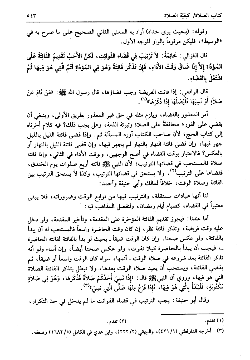 قال الغزالي: خَاتمَةٌ: لاَ تَرْتيبَ فِي قَضَاءِ الفَوَائِتِ، لَكِنَّ الأَحَبَّ تَقْدِيمُ الفَائِتَةَ عَلَى المُؤَدَّاة إِلاَّ إِذَا ضَاقَ وَقْتُ الأَدَاءِ، فَإِنْ تَذَكَّرَ فَائِتَةٌ وَهُوَ فِي المُؤَدَّاةِ أَتَمَّ الَّتِي هُوَ فِيهَا ثُمَّ اشْتَغَلَ بِالقَضَاءِ.