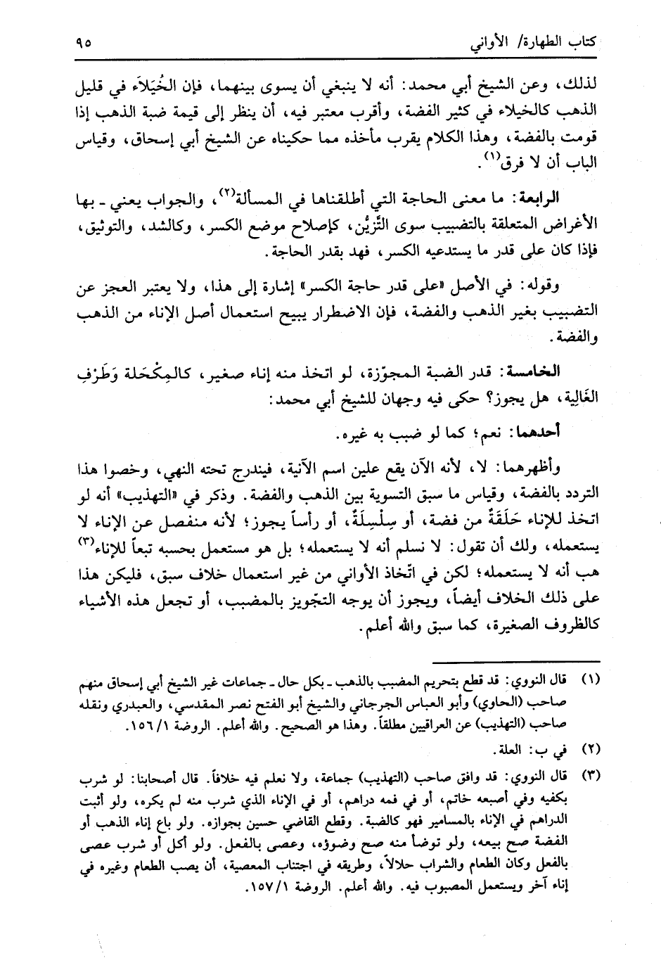 (¬1) قال النووي: قد قطع بتحريم المضبب بالذهب -بكل حال- جماعات غير الشيخ أبي إسحاق منهم صاحب (الحاوي) وأبو العباس الجرجاني والشيخ أبو الفتح نصر المقدسي، والعبدري ونقله صاحب (التهذيب) عن العراقيين مطلقاً. وهذا هو الصحيح. والله أعلم. الروضة 1/ 156.