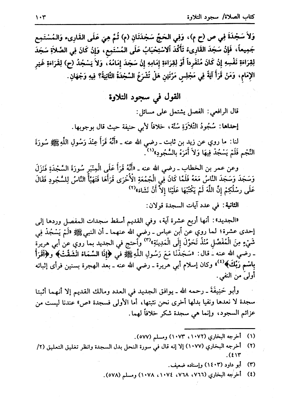 وأبو حَنِيفَةَ -رحمه الله- يوافق الجديد في العدد ومالك القديم إلا أنهما أثبتا سجدة لا نعدها ونفيا بدلها أخرى نحن نثبتها، أما الأولى فسجدة "ص" عندنا ليست من عزائم السجود، وإنما هي سجدة شكر خلافاً لهما.