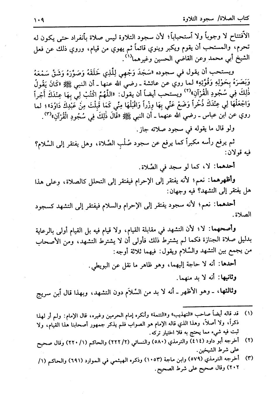 ويستحب أن يقول في سجوده "سَجَدَ وَجْهِي لِلَّذِي خَلَقَهُ وَصَوَّرَهُ وَشَقَّ سَمْعَهُ وَبَصَرَهُ بِحَوْلِهِ وَقُوَّتِهِ" لما روي عن عائشة -رضي الله عنها- أن النبي -صلى الله عليه وسلم- "كَانَ يَقُولُ ذلِكَ فِي سُجُودِ الْقُرْآنِ" (¬2) ويستحب أيضاً أن يقول: "اللَّهُمَّ اكْتُبْ لِي بِهَا عِنْدَكَ أَجْراً وَاجْعَلْهَا لِي عِنْدَكَ ذُخْراً وَضَعْ عَنِّي بِهَا وِزْراً وَاقْبَلْهَا مِنِّي كَمَا قَبِلْتَ مِنْ عَبْدِكَ دَاوُدَ"؛ لما روي عن ابن عباس -رضي الله عنهما- أن النبي -صلى الله عليه وسلم- "قَالَ ذلِكَ فِي سُجُودِ الْقُرْآنِ" (¬3).