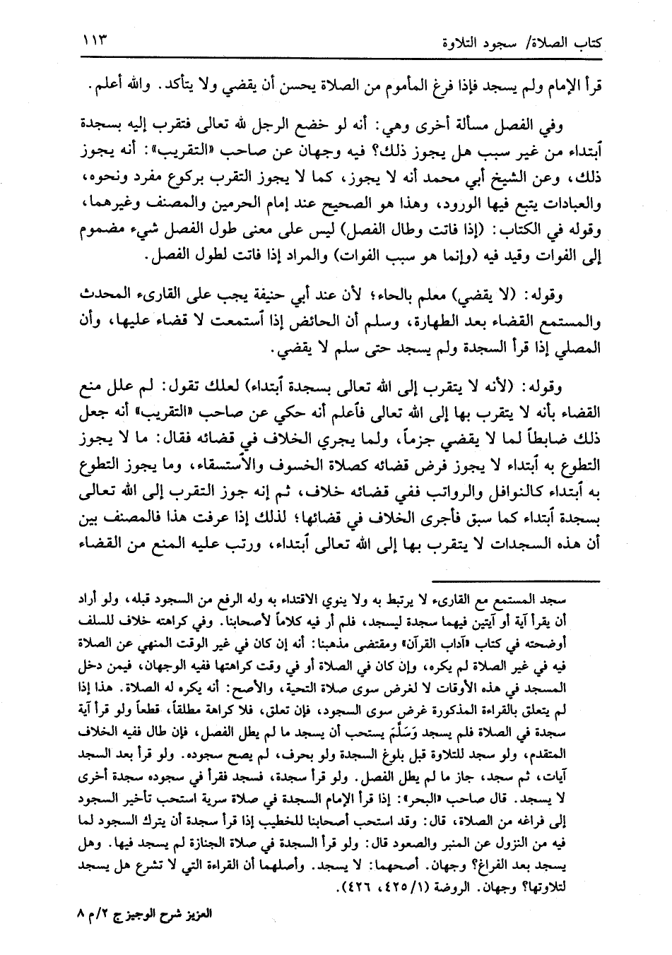 وفي الفصل مسألة أخرى وهي: أنه لو خضع الرجل لله تعالى فتقرب إليه بسجدة ابتداء من غير سبب هل يجوز ذلك؟ فيه وجهان عن صاحب "التقريب": أنه يجوز ذلك، وعن الشيخ أبي محمد أنه لا يجوز، كما لا يجوز التقرب بركوع مفرد ونحوه، والعبادات يتبع فيها الورود، وهذا هو الصحيح عند إمام الحرمين والمصنف وغيرهما، وقوله في الكتاب: (إذا فاتت وطال الفصل) ليس على معنى طول الفصل شيء مضموم إلى الفوات وقيد فيه (وإنما هو سبب الفوات) والمراد إذا فاتت لطول الفصل.