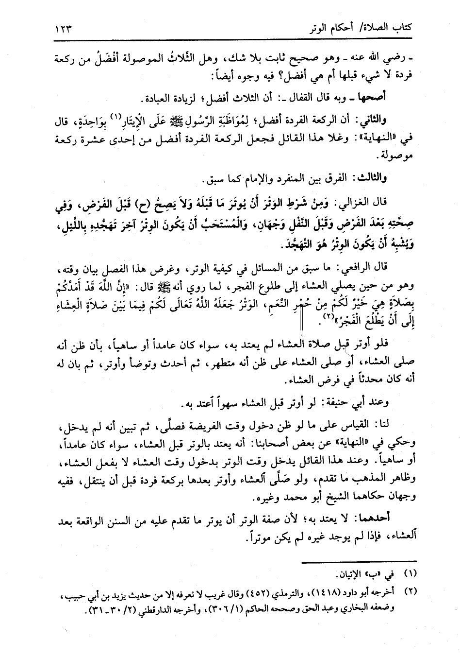 -رضي الله عنه- وهو صحيح ثابت بلا شك، وهل الثَّلاثُ الموصولة أفْضَلُ من ركعة فردة لا شيء قبلها أم هي أفضل؟ فيه وجوه أيضاً: