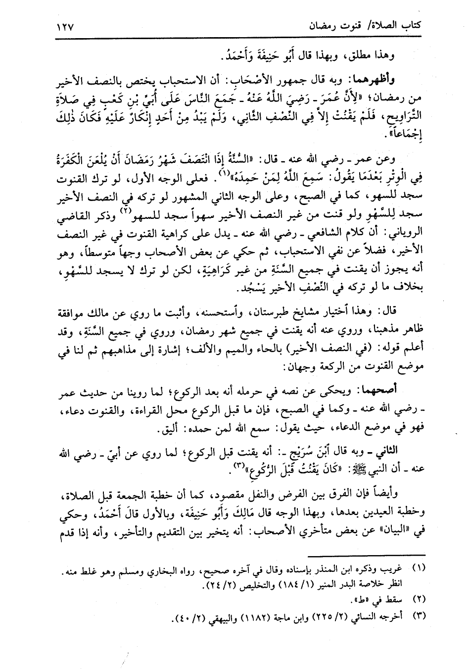 وأظهرهما: وبه قال جمهور الأصْحَابِ: أن الاستحباب يختص بالنصف الأخير من رمضان؛ "لِأَنَّ عُمَرَ -رَضِيَ اللهُ عَنْهُ- جَمَعَ النَّاسَ عَلَى أُبَيِّ بنِ كَعْبٍ فِي صَلاَةِ التَّرَاوِيحِ، فَلَمْ يَقْنُتْ إِلاَّ فِي النِّصْفِ الثَّانِي، وَلَمْ يَبْدُ مِنْ أَحَدٍ إِنْكَارٌ عَلَيْهِ فَكَانَ ذلِكَ إِجْمَاعاً".