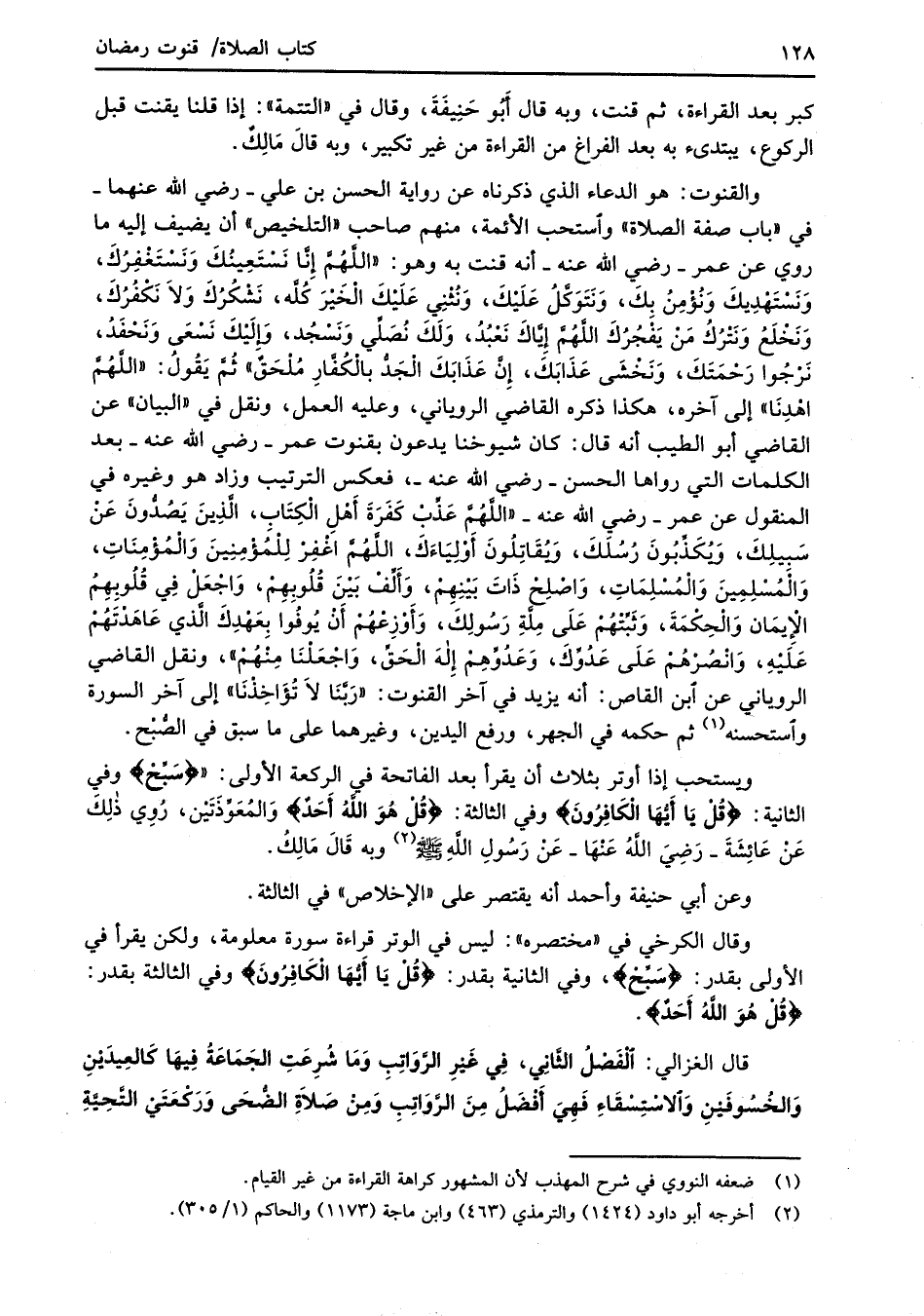 والقنوت: هو الدعاء الذي ذكرناه عن رواية الحسن بن علي -رضي الله عنهما- في "باب صفة الصلاة" واستحب الأئمة، منهم صاحب "التلخيص" أن يضيف إليه ما روي عن عمر -رضي الله عنه- أنه قنت به وهو: "اللَّهُمَّ إنَّا نَسْتَعِينُكَ وَنَسْتَغفِرُكَ، وَنسْتَهْدِيكَ وَنُؤْمِنُ بِكَ، وَنَتَوَكَّلُ عَلَيْكَ، وَنُثْنِي عَلَيْكَ الْخَيْرَ كُلَّه، نَشْكُرُكَ وَلاَ نَكْفُرُكَ، وَنَخْلَعُ وَنَتْرُكُ مَنْ يَفْجُركَ اللَّهُمَّ إيَّاكَ نَعْبُدُ، وَلَكَ نُصَلِّي وَنَسْجُد، وإِلَيْكَ نَسْعَى وَنَحْفَدُ، نَرْجُوا رَحْمَتَكَ، وَنَخْشَى عَذَابَكً، إِنَّ عَذَابَكَ الْجَدُّ بالْكُفَّارِ مُلْحَقٌ" ثُمَّ يَقُولُ: "اللَّهُمَّ اهْدِنَا" إلى آخره، هكذا ذكره القاضي الروياني، وعليه العمل، ونقل في "البيان" عن القاضي أبو الطيب أنه قال: كان شيوخنا يدعون بقنوت عمر -رضي الله عنه- بعد الكلمات التي رواها الحسن -رضي الله عنه-، فعكس الترتيب وزاد هو وغيره في المنقول عن عمر -رضي الله عنه- "اللَّهُمَّ عَذِّبْ كَفَرَةَ أَهْلِ الْكِتَاب، الَّذِينَ يَصُدُّونَ عَنْ سَبيلِكَ، وَيُكَذِّبُونَ رُسُلَكَ، وَيُقَاتِلُونَ أَوْلِيَاءَكَ، اللَّهُمَّ اغْفِرْ لِلْمُؤْمِنِينَ والمُؤْمِنَاتِ، وَالْمُسْلِمِينَ وَالْمُسْلِمَاتِ، وَاصْلِحْ ذَاتَ بَيْنِهِمْ، وألِّفْ بَيْنَ قلُوبِهِمْ، وَاجْعَلْ فِي قُلُوبِهِمُ الإيمَان وَالْحِكْمَةَ، وَثَبِّتْهُمْ عَلَى مِلَّةِ رَسُولِكَ، وَأَوْزِعْهُمْ أَنْ يُوفُوا بِعَهْدِكَ الَّذي عَاهَدْتَهُمْ عَلَيْهِ، وَانْصُرهُمْ عَلَى عَدُوِّكَ، وَعَدُوِّهِمْ إِلهَ الْحَقِّ، وَاجْعَلْنَا مِنْهُمْ"، ونقل القاضي الروياني عن ابن القاص: أنه يزيد في آخر القنوت: "رَبَّنَا لاَ تُؤَاخِذْنَا" إلى آخر السورة واستحسنه (¬1) ثم حكمه في الجهر، ورفع اليدين، وغيرهما على ما سبق في الصُّبْح.