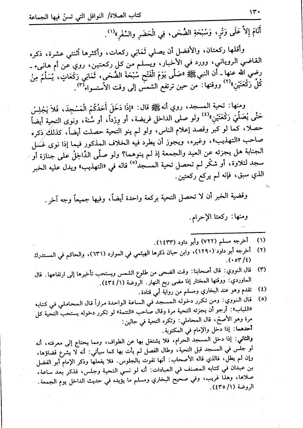 (¬5) قال النووي: ومن تكرر دخوله المسجد في الساعة الواحدة مراراً قال المحاملي في كتابه "اللباب": أرجو أن يجزئه التحية مرة وقال صاحب "التتمة" لو تكرر دخوله يستحب التحية كل مرة وهو الأصحّ، قال المحاملي: وتكره التحية في حالين: