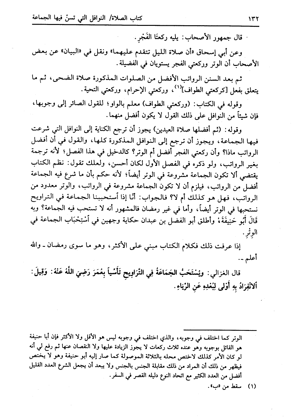 قال الغزالي: ويُسْتَحَبُّ الجَمَاعَةُ فِي التَّرَاوِيحِ تأسِّياً بِعُمَرَ رَضِيَ الله عَنْهُ: وَقِيلَ: الانْفِرَادُ بِهِ أَوْلى لِبُعْدِهِ عَنِ الرِّيَاءِ.