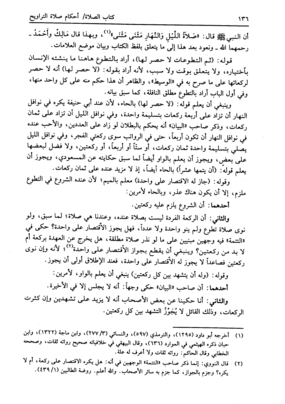 أن النبي -صلى الله عليه وسلم- قال: "صَلاَةُ اللَّيْلِ وَالنَّهَارِ مَثْنَى مَثْنَى" (¬1)، وبهذا قال مَالِكٌ وأَحْمَدُ -رحمهما الله- ونعود بعد هذا إلى ما يتعلق بلفظ الكتاب وبيان موضع العلامات.