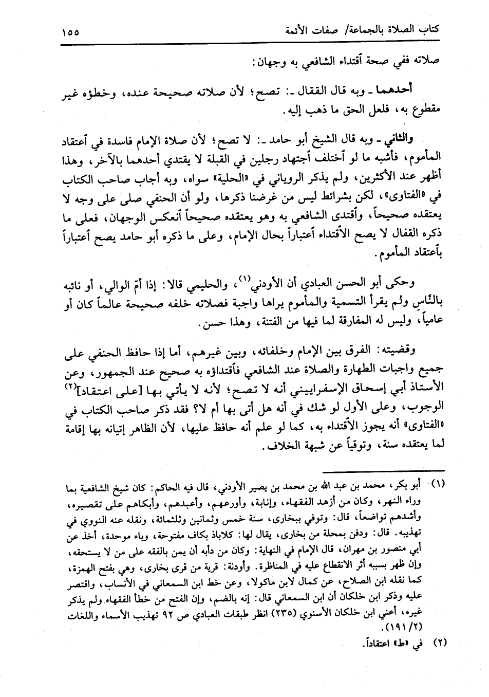 والثاني -وبه قال الشيخ أبو حامد-: لا تصح؛ لأن صلاة الإمام فاسدة في اعتقاد المأموم، فأشبه ما لو اختلف اجتهاد رجلين في القبلة لا يقتدي أحدهما بالآخر، وهذا أظهر عند الأكثرين، ولم يذكر الروياني في "الحلية" سواه، وبه أجاب صاحب الكتاب في "الفتاوى"، لكن بشرائط ليس من غرضنا ذكرها، ولو أن الحنفي صلى على وجه لا يعتقده صحيحاً، واقتدى الشافعي به وهو يعتقده صحيحاً انعكس الوجهان، فعلى ما ذكره القفال لا يصح الاقتداء أعتباراً بحال الإمام، وعلى ما ذكره أبو حامد يصح اعتباراً باعتقاد المأموم.