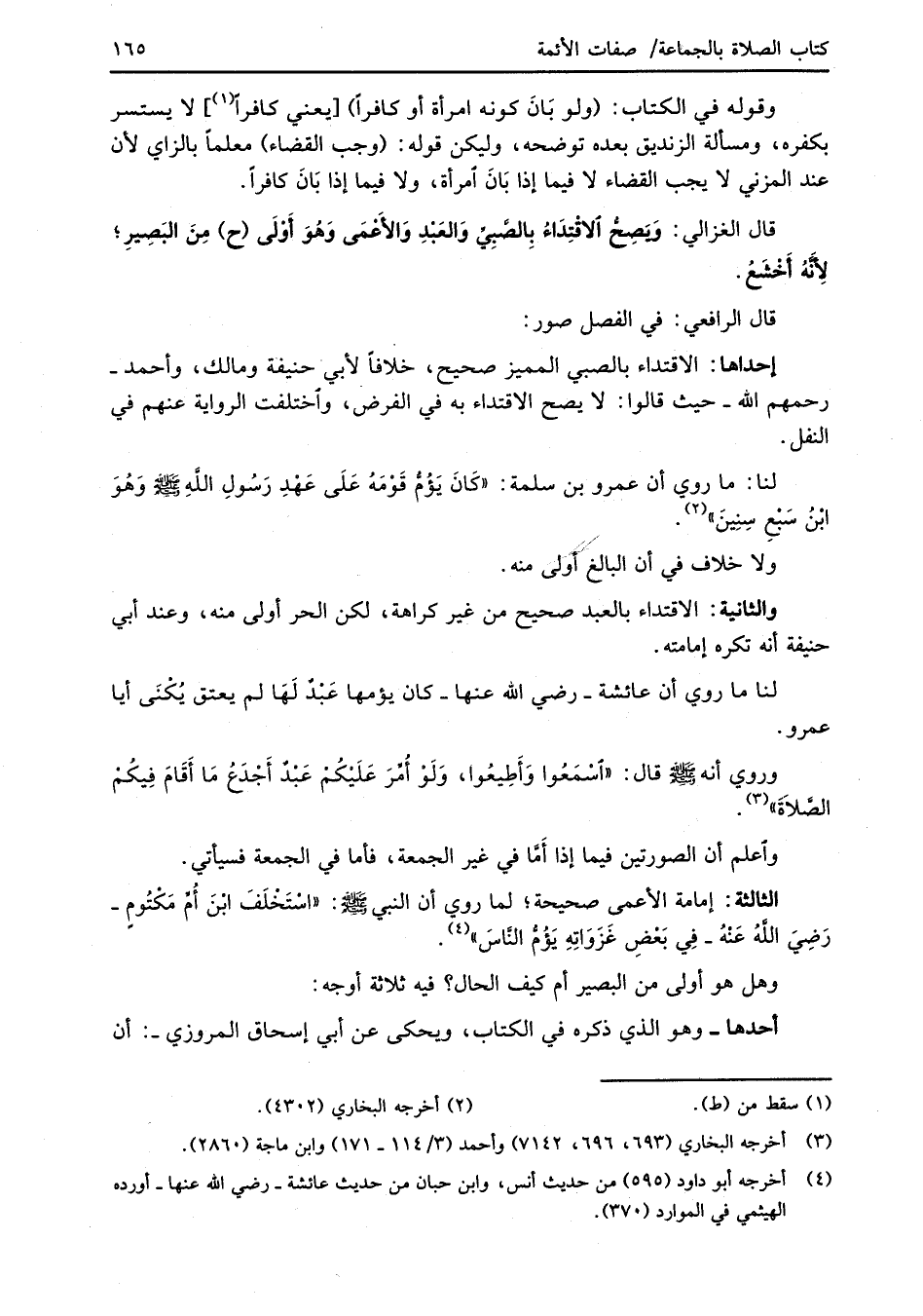 قال الغزالي: وَيصِحُّ الاقْتِدَاءُ بِالصَّبِيِّ وَالعَبْدِ وَالأعْمَى وَهُوَ أَوْلَى (ح) مِنَ البَصِيرِ؛ لِأَنَّهُ أَخْشَعُ.