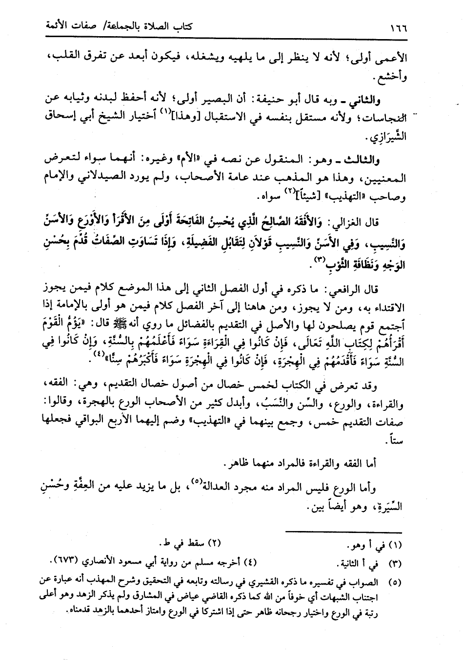 قال الغزالي: وَالأَفْقَةُ الصَّالِحُ الَّذِي يُحْسِنُ الفَاتِحَةَ أَوْلَى مِنَ الأَقْرَأ وَالأَوْرَعِ وَالأسَنِّ وَالنَّسِيبِ، وَفِي الأَسنِّ وَالنَّسِيبِ قَوْلاَنِ لِتَقَابُلِ الفَضِيلَةِ، وإذَا تَسَاوَتِ الصِّفَاتُ قُدِّمَ بِحُسْنِ الوَجْهِ وَنَظَافَةِ الثَّوبِ (¬3).