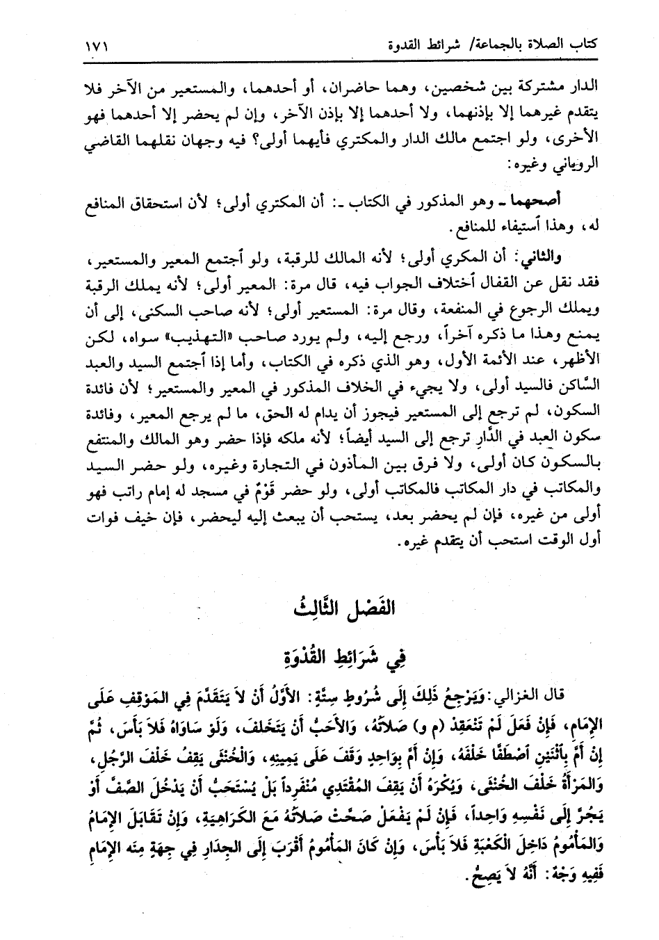 والثاني: أن المكري أولى؛ لأنه المالك للرقبة، ولو اجتمع المعير والمستعير، فقد نقل عن القفال اختلاف الجواب فيه، قال مرة: المعير أولى؛ لأنه يملك الرقبة ويملك الرجوع في المنفعة، وقال مرة: المستعير أولى؛ لأنه صاحب السكنى، إلى أن يمنع وهذا ما ذكره آخراً، ورجع إليه، ولم يورد صاحب "التهذيب" سواه، لكن الأظهر، عند الأئمة الأول، وهو الذي ذكره في الكتاب، وأما إذا اجتمع السيد والعبد السَّاكن فالسيد أولى، ولا يجيء في الخلاف المذكور في المعير والمستعير؛ لأن فائدة السكون، لم ترجع إلى المستعير فيجوز أن يدام له الحق، ما لم يرجع المعير، وفائدة سكون العبد في الدَّارِ ترجع إلى السيد أيضاً؛ لأنه ملكه فإذا حضر وهو المالك والمنتفع بالسكون كان أولى؛ ولا فرق بين المأذون في التجارة وغيره، ولو حضر السيد والمكاتب في دار المكاتب فالمكاتب أولى، ولو حضر قَوْمٌ في مسجد له إمام راتب فهو أولى من غيره، فإن لم يحضر بعد، يستحب أن يبعث إليه ليحضر، فإن خيف فوات أول الوقت استحب أن يتقدم غيره.