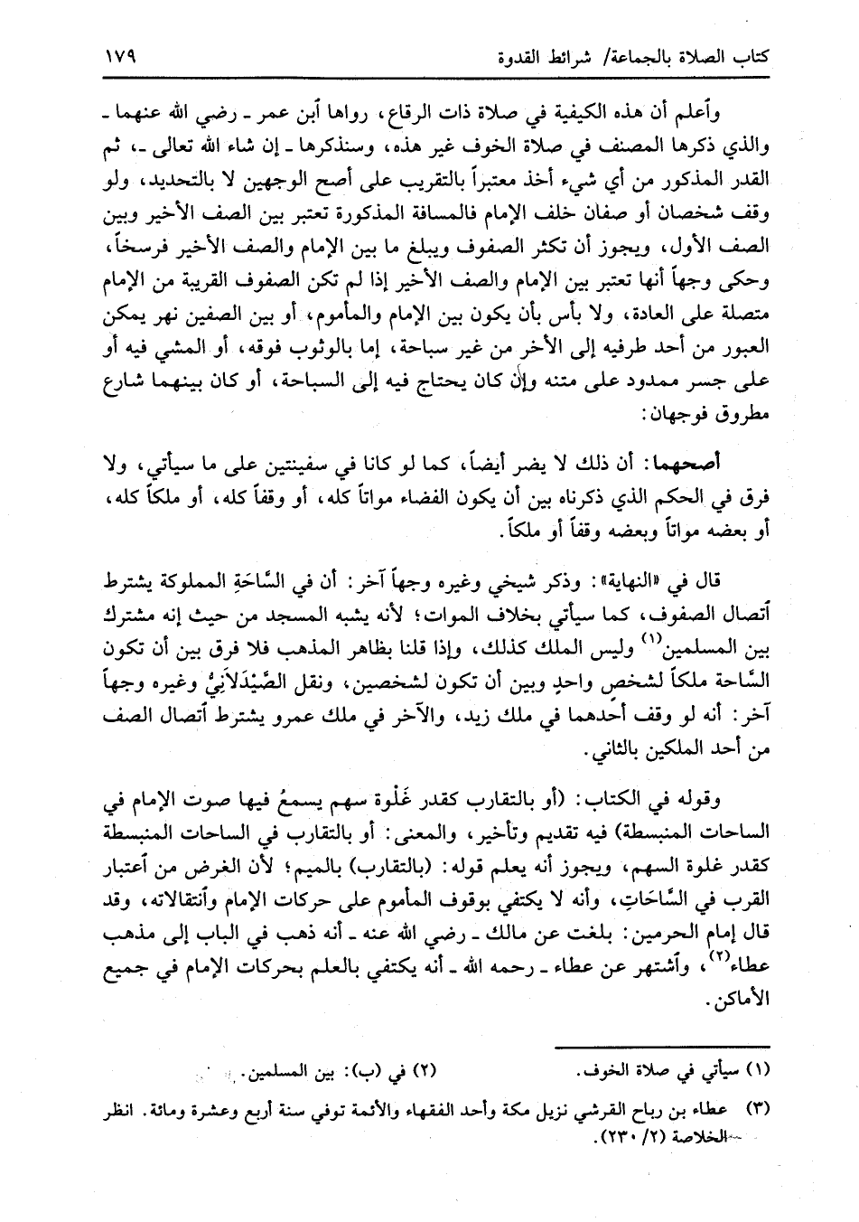وقوله في الكتاب: (أو بالتقارب كقدر غَلْوة سهم يسمعُ فيها صوت الإمام في الساحات المنبسطة) فيه تقديم وتأخير، والمعنى: أو بالتقارب في الساحات المنبسطة كقدر غلوة السهم، ويجوز أنه يعلم قوله: (بالتقارب) بالميم؛ لأن الغرض من اعتبار القرب في السَّاحَاتِ، وأنه لا يكتفي بوقوف المأموم على حركات الإمام وانتقالاته، وقد قال إمام الحرمين: بلغت عن مالك -رضي الله عنه- أنه ذهب في الباب إلى مذهب عطاء (¬3)، واشتهر عن عطاء -رحمه الله- أنه يكتفي بالعلم بحركات الإمام في جميع الأماكن.