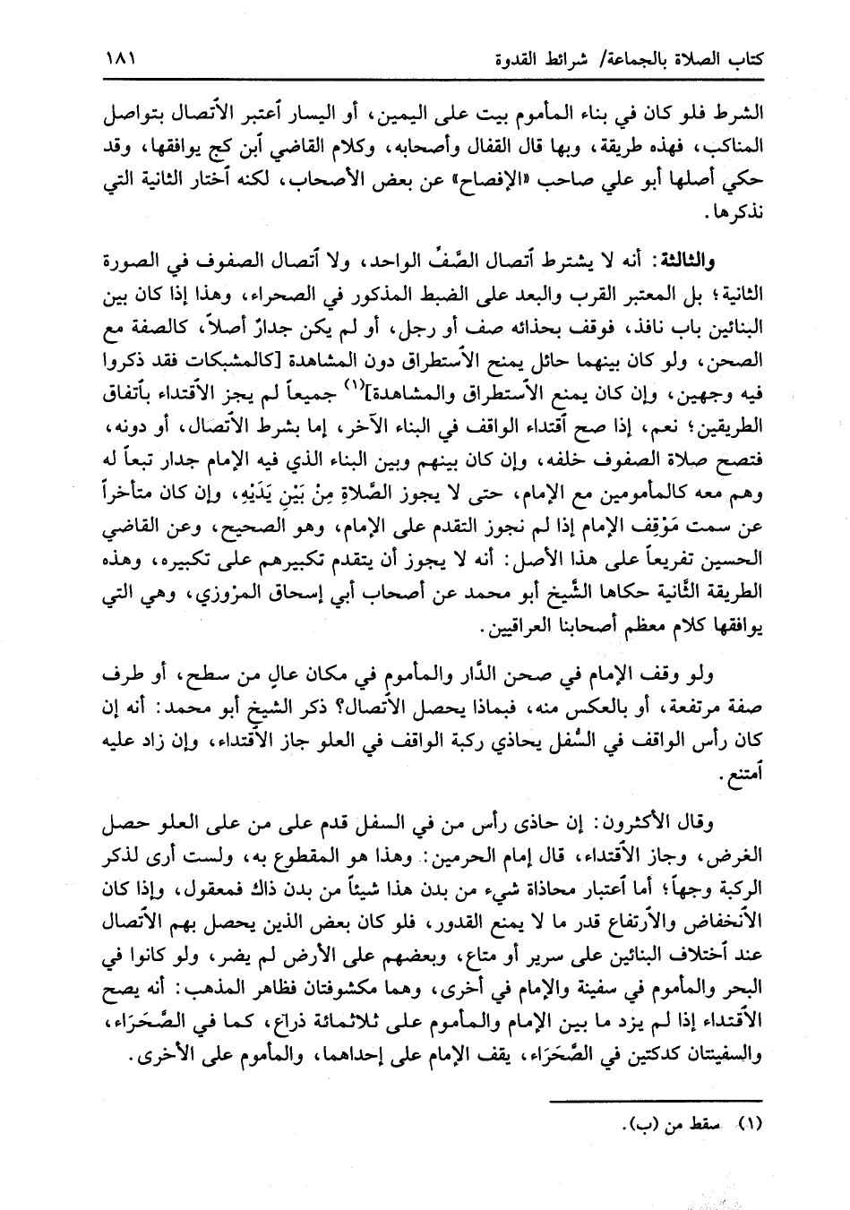 والثالثة: أنه لا يشترط اتصال الصَّفِّ الواحد، ولا اتصال الصفوف في الصورة الثانية؛ بل المعتبر القرب والبعد على الضبط المذكور في الصحراء، وهذا إذا كان بين البنائين باب نافذ، فوقف بحذائه صف أو رجل، أو لم يكن جدارٌ أصلاً، كالصفة مع الصحن، ولو كان بينهما حائل يمنح الاستطراق دون المشاهدة [كالمشبكات فقد ذكروا فيه وجهين، وإن كان يمنع الاستطراق والمشاهدة] (¬1) جميعاً لم يجز الاقتداء باتفاق الطريقين؛ نعم، إذا صح اقتداء الواقف في البناء الآخر، إما بشرط الاتصال، أو دونه، فتصح صلاة الصفوف خلفه، وإن كان بينهم وبين البناء الذي فيه الإمام جدار تبعاً له وهم معه كالمأمومين مع الإمام، حق لا يجوز الصَّلاةِ مِنْ بَيْنِ يَدَيْهِ، وإن كان متأخراً عن سمت مَوْقِف الإمام إذا لم نجوز التقدم على الإمام، وهو الصحيح، وعن القاضي الحسين تفريعاً على هذا الأصل: أنه لا يجوز أن يتقدم تكبيرهم على تكبيره، وهذه الطريقة الثَّانية حكاها الشَّيخ أبو محمد عن أصحاب أبي إسحاق المروزي، وهي التي يوافقها كلام معظم أصحابنا العراقيين.