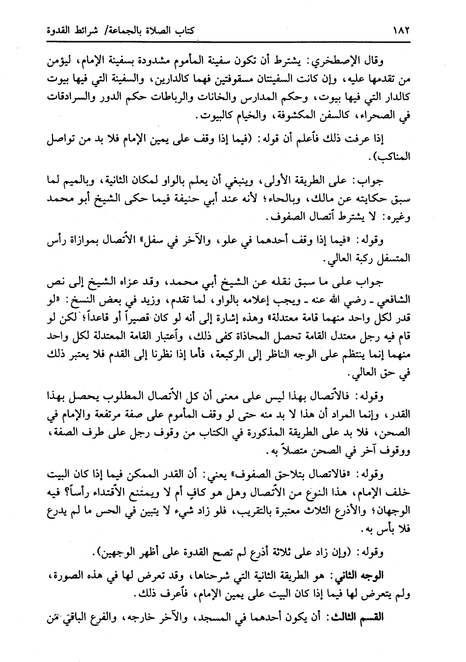وقال الإصطخري: يشترط أن تكون سفينة المأموم مشدودة بسفينة الإمام، ليؤمن من تقدمها عليه، وإن كانت السفينتان مسقوفتين فهما كالدارين، والسفينة التي فيها بيوت كالدار التي فيها ييوت، وحكم المدارس والخانات والرباطات حكم الدور والسرادقات في الصحراء، كالسفن المكشوفة، والخيام كالبيوت.