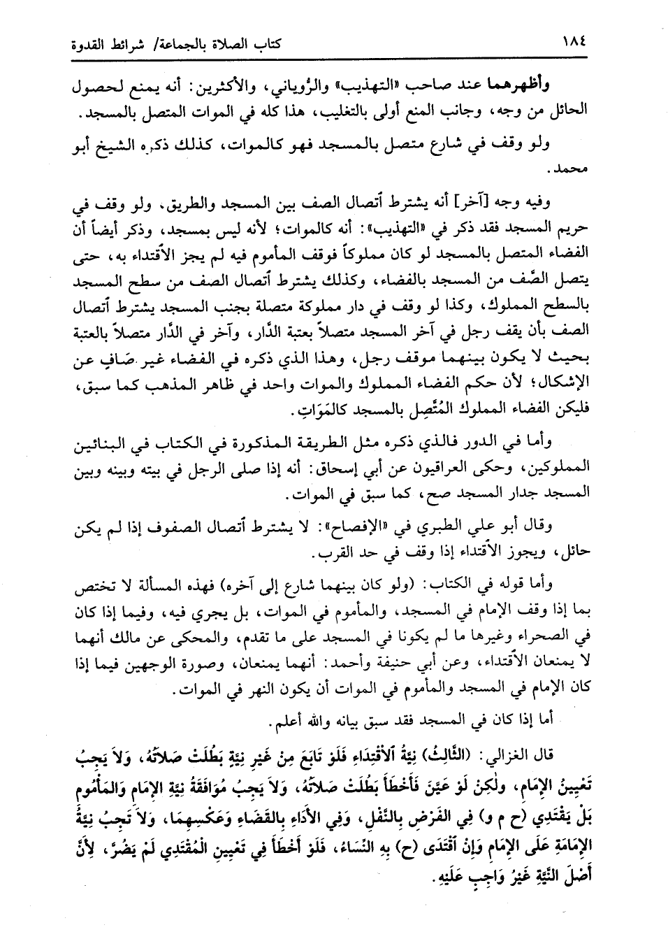 قال الغزالي: (الثَّالِثُ) نِيَّةُ الاقْتِدَاءِ فَلَوْ تَابَعَ مِنْ غَيْرِ نِيَّةٍ بَطُلَتْ صَلاتُهُ، وَلاَ يَجبُ تَعْيِينُ الإِمَامِ، ولكِنْ لَوْ عَيَّنَ فَأخْطَأ بَطُلَتْ صَلاتُهُ، وَلاَ يَجِبُ مُوَافَقَةُ نِيَّةِ الإِمَامِ وَالمَأْمُومِ بَلْ يَقْتَدِي (ح م و) فِي الفَرْضِ بِالنَّفْلِ، وَفِي الأَدَاءِ بِالقَضَاءِ وَعَكْسِهِمَا، ولاَ تَجِبُ نِيَّةُ الإِمَامَةِ عَلَى الإِمَامِ وإن اقْتَدَى (ح) بِهِ النِّسَاءُ، فَلَوْ أَخْطَأَ فِي تَعْيِينِ الْمُقْتَدِي لَمْ يَضُرَّ، لِأَنَّ أَصْلَ النَّيَّةِ غَيْرُ وَاجِبٍ عَلَيْهِ.