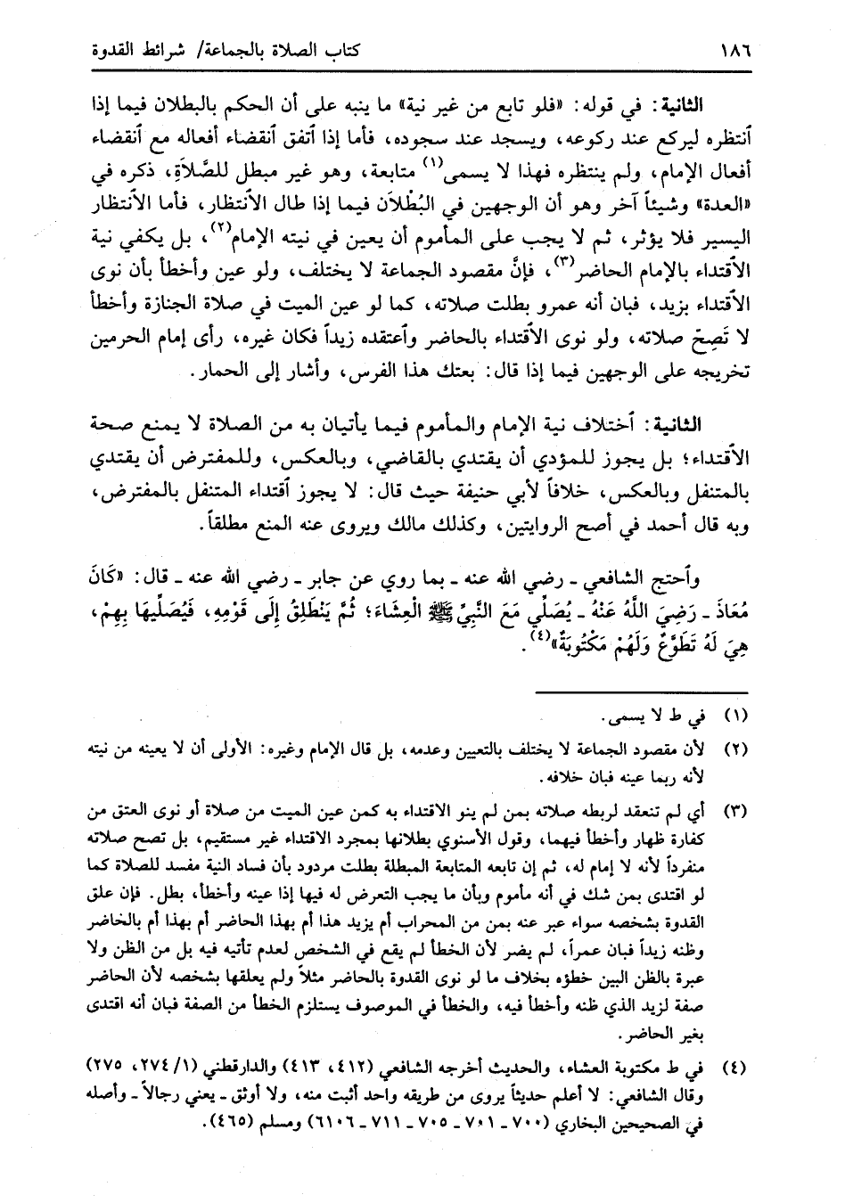 الثانية: اختلاف نية الإمام والمأموم فيما يأتيان به من الصلاة لا يمنع صحة الاقتداء؛ بل يجوز للمؤدي أن يقتدي بالقاضي، وبالعكس، وللمفترض أن يقتدي بالمتنفل وبالعكس، خلافاً لأبي حنيفة حيث قال: لا يجوز اقتداء المتنفل بالمفترض، وبه قال أحمد في أصح الروايتين، وكذلك مالك ويروى عنه المنع مطلقاً.