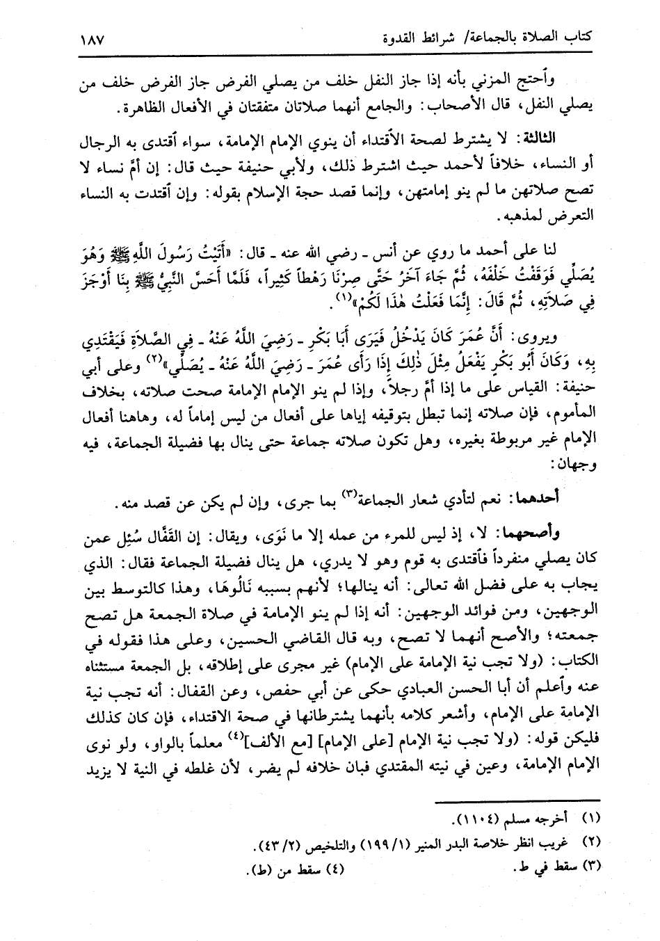 الثالثة: لا يشترط لصحة الاقتداء أن ينوي الإمام الإمامة، سواء اقتدى به الرجال أو النساء، خلافاً لأحمد حيث اشترط ذلك، ولأبي حنيفة حيث قال: إن أمَّ نساء لا تصح صلاتهن ما لم ينو إمامتهن، وإنما قصد حجة الإسلام بقوله: وإن اقتدت به النساء التعرض لمذهبه.