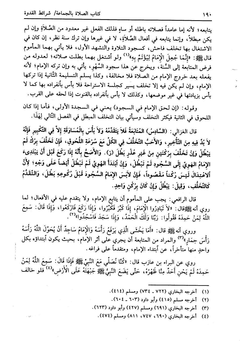 قال الغزالي: (السَّادِسُ) المُتَابَعَةُ فلَا يَتَقَدَّمُهُ وَلاَ بَأْسَ بِالمُسَاوَقَةِ إِلاَّ فِي التَّكْبِيرِ فَإِنَّهُ لاَ بُدَّ فِيهِ مِنَ التَّأخِيرِ، وَالأَحَبُّ التَّخَلُّفُ فِي الكُلِّ مَعَ سُرْعَةِ اللُّحُوقِ، فَإِنْ تَخَلَّفَ بِرُكْن لَمْ يَبْطُلْ وَإنْ تَخَلَّفَ بِرُكْنَيْنِ مِنْ غيرِ عُذرِ بَطُلَ (ز). وَالأَصَحُّ بِأنَّه إِذَا رَكَعَ قَبْل أَنْ يَبْتَدِئَ الإِمَامُ الهَوِيَّ إلَى السُّجُودِ لَمْ تَبْطُلْ، وَإِنْ ابْتَدَأَ الهُوِيَّ لَمْ تَبْطُلْ أَيْضًا عَلَى وَجْهٍ؛ لِأَنَّ الاعتِدَالَ لَيْسَ رُكْناً مَقْصُودًا، فَإِنْ لاَبَسَ الإِمَامُ السُّجُودَ قَبْلَ رُكُوعِهِ بَطُلَ، وَالتَّقَدُّمُ كَالتَّخَلُّفِ، وَقِيلَ: يَبْطُلُ وإنْ كَانَ بِرُكْنٍ وَاحِدٍ.