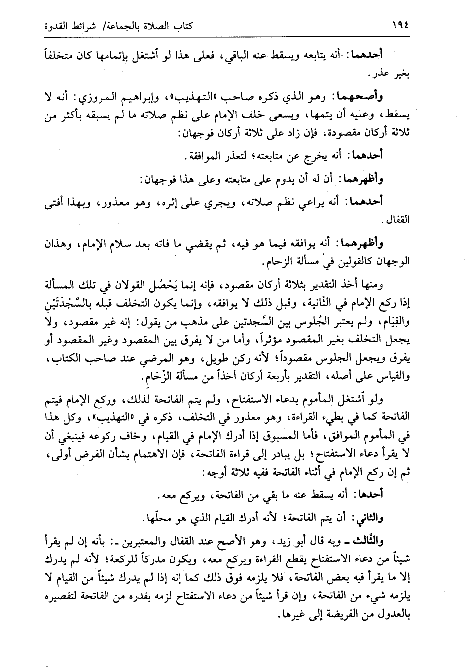 وأصحهما: وهو الذي ذكره صاحب "التهذيب"، وإبراهيم المروزي: أنه لا يسقط، وعليه أن يتمها، ويسعى خلف الإمام على نظم صلاته ما لم يسبقه بأكثر من ثلاثة أركان مقصودة، فإن زاد على ثلاثة أركان فوجهان: