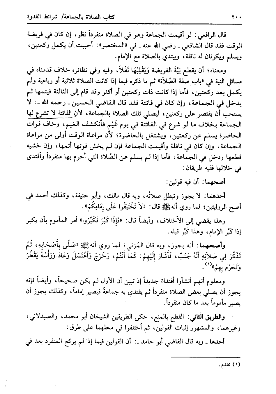 ومعناه؛ أن يقطع نِيَّةَ الفريضة وَيقْلِبُهَا نَفْلاً، وفيه وفي نظائره خلاف قدمناه في مسائل النية في "باب صفة الصَّلاَة" ثم ما ذكره فيما إذا كانت الصلاة ثلاثية أو رباعية ولم يكمل بعد ركعتين، فأما إذا كانت ذات ركعتين أو أكثر وقد قام إلى الثالثة فيتمها ثم يدخل في الجماعة، وإن كان في فائتة فقد قال القاضي الحسين -رحمه الله-: لا يستحب أن يقتصر على ركعتين، ليصلي تلك الصلاة بالجماعة، لأن الفائتة لا تشرع لها الجماعة بخلاف ما لو شرع في الفائتة في يوم غَيْم فانكشف الغيم، وخاف فوات الحاضرة يسلم عن ركعتين، ويشتغل بالحاضرة؛ لأن مراعاة الوقت أولى من مراعاة الجماعة، وإن كان في نافلة وأقيمت الجماعة فإن لم يخش فوتها أتمها، وإن خشيه قطعها ودخل في الجماعة، فأما إذا لم يسلم عن الصَّلاة التي أحرم بها منفرداً واقتدى في خلالها ففيه طريقان:
