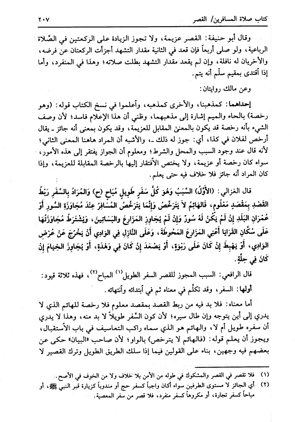 قال الغزالي: (الأَوَّلُ) السَّبَبُ وَهُوَ كُلُّ سَفَرٍ طَوِيلٍ مُبَاحٍ (ح) وَالمُرَادُ بِالسَّفَرِ رَبْطُ القَصْدِ بِمَقْصَدٍ مَعْلُومٍ، فَالهَائِمُ لاَ يَتَرَخَّصُ وَإنَّمَا يَتَرَخَّصُ المُسَافِرُ عِنْدَ مُجَاوَزَةِ السُّورِ أَوْ عُمْرَانِ البَلَدِ إنْ لَمْ يَكُنْ لَهُ سُورٌ وَإِنْ لَمْ يُجَاوِزِ المَزَارعَ والبَسَاتِينَ، وَيُشْتَرَطُ مُجَاوَزَتُهَا عَلَى سُكَّانِ القَرَايَا أَعْنِي المَزَارعَ المَحُوطَةَ، وَعَلَى النَّازِلِ فِي الوَادِي أَنْ يَخْرُجَ عَنْ عُرْضِ الوَادِي، أَوْ يَهْبِطَ إنْ كَانَ عَلَى رَبْوَةٍ، أَوْ يَصْعَدَ إنْ كَانَ فِي وَهْدَةٍ، أَوْ يُجَاوِزَ الخِيَامَ إنْ كَانَ فِي حِلَّةٍ.