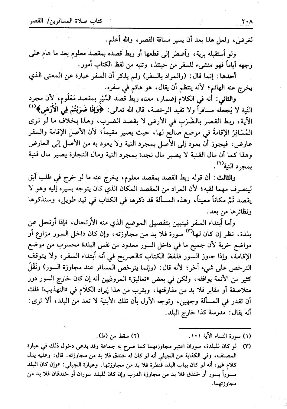 (¬3) لو كان للبلدة، سوران اعتبر مجاوزتهما كلما صرح به جماعة وقد يدعى دخول ذلك في عبارة المصنف، وفي الكفاية عن الجيلي أنه لو كان له خندق فلا بد من مجاوزته. قال: وعليه يدل كلام غيره أنه لو كان بباب البلد قنطرة فلا بد من مجاوزتها. وعبارة الجبلي: "وإن كان البلد مسوراً بسور أو خندق فلا بد من مجاوزة الدرب وإن كان للبلد سوران أو خندقان فلا بد من مجاوزتهما.