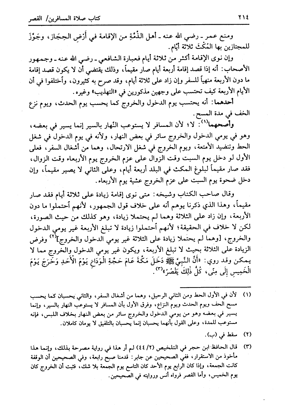 (¬3) قال الحافظ ابن حجر في التلخيص (2/ 44) لم أر هذا في رواية مصرحة بذلك، وإنما هذا مأخوذ من الاستقرار، ففي الصحيحين عن جابر: قدمنا صبح رابعة، وفي الصحيحين أن الوقفة كانت الجمعة، وإذا كان الرابع يوم الأحد كان التاسع يوم الجمعة بلا شك، فثبت أن الخروج كان يوم الخميس، وأما القصر فرواه أنس وروايته في الصحيحين.