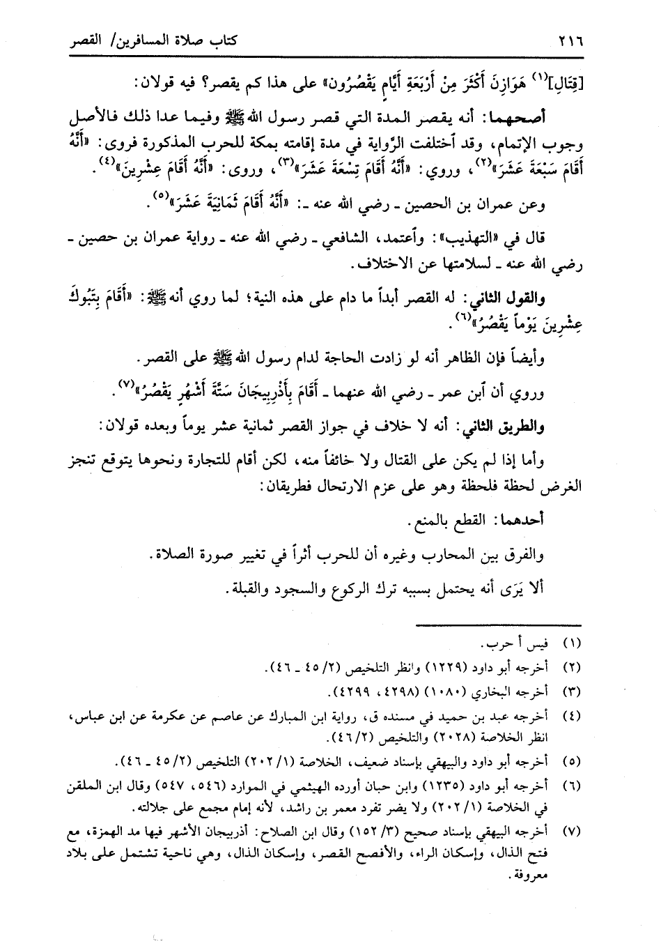أصحهما: أنه يقصر المدة التي قصر رسول الله -صلى الله عليه وسلم- وفيما عدا ذلك فالأصل وجوب الإتمام، وقد اختلفت الرَّواية في مدة إقامته بمكة للحرب المذكورة فروى: "أَنَّهُ أَقَامَ سَبْعَةَ عَشَرَ" (¬2)، وروي: "أَنَّهُ أَقَامَ تِسْعَةَ عَشَرَ" (¬3)، وروى: "أَنَّهُ أَقَامَ عِشْرِينَ" (¬4).