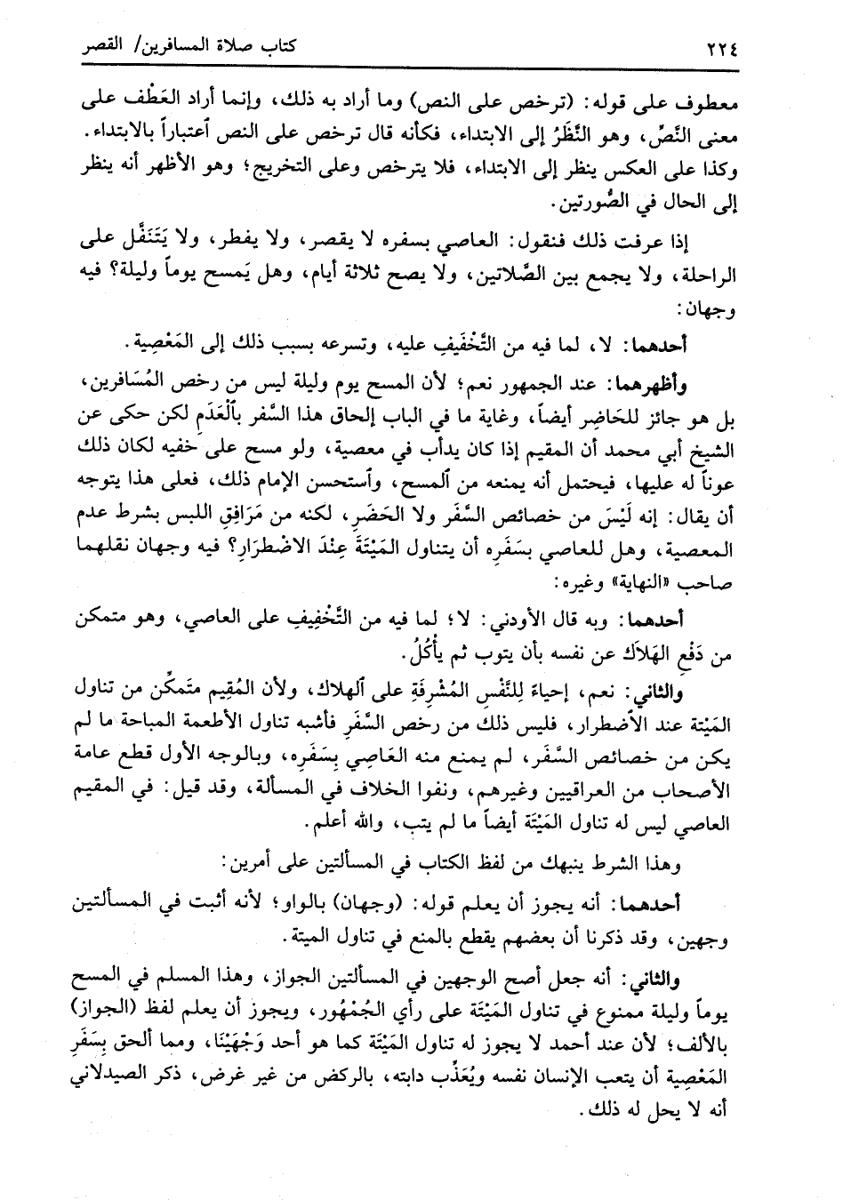 وأظهرهما: عند الجمهور نعم؛ لأن المسح يوم وليلة ليس من رخص المُسَافرين، بل هو جائز للحَاضِر أيضاً، وغاية ما في الباب إلحاق هذا السَّفر باَلْعَدَمِ لكن حكى عن الشيخ أبي محمد أن المقيم إذا كان يدأب في معصية، ولو مسح على خفيه لكان ذلك عوناً له عليها، فيحتمل أنه يمنعه من المسح، واستحسن الإمام ذلك، فعلى هذا يتوجه أن يقال: إنه لَيْسَ من خصائص السَّفَر ولا الحَضَرِ، لكنه من مَرَافِقِ اللبس بشرط عدم المعصية، وهل للعاصي بسَفَرِه أن يتناول المَيْتَةَ عِنْدَ الاضْطرَارِ؟ فيه وجهان نقلهما صاحب، "النهاية" وغيره: