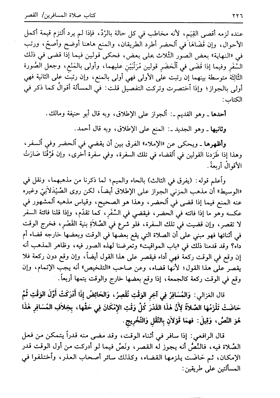 قال الغزالي: وَالمُسَافِرُ فِي آخِرِ الوَقْتِ نُقْصِرُ، وَالحَائِضُ إِذَا أَدْرَكَت أَوَّلَ الوَقْتِ ثُمَّ حَاضَتْ تَلْزَمُهَا الصَّلاةُ لِأَنَّ هذَا القَدْرَ كُلَّ وَقْتِ الإِمْكَانَ فِي حَقِّها، بِخِلاَفِ المُسَافِرِ هذَا هُوَ النَّصُّ، وَقِيلَ: فهمَا قَوْلاَنِ بِالنَّقْلِ وَالتَّخْرِيجِ.