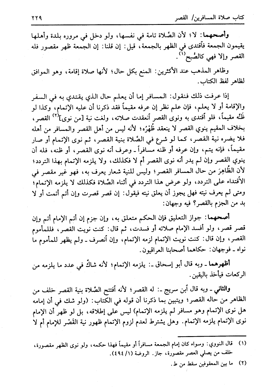 (¬1) قال النووي: وسواء كان إمام الجمعة مسافراً أو مقيماً فهذا حكمه، ولو نوى الظهر مقصورة، خلف من يصلي العصر مقصورة، جاز. الروضة (1/ 494).