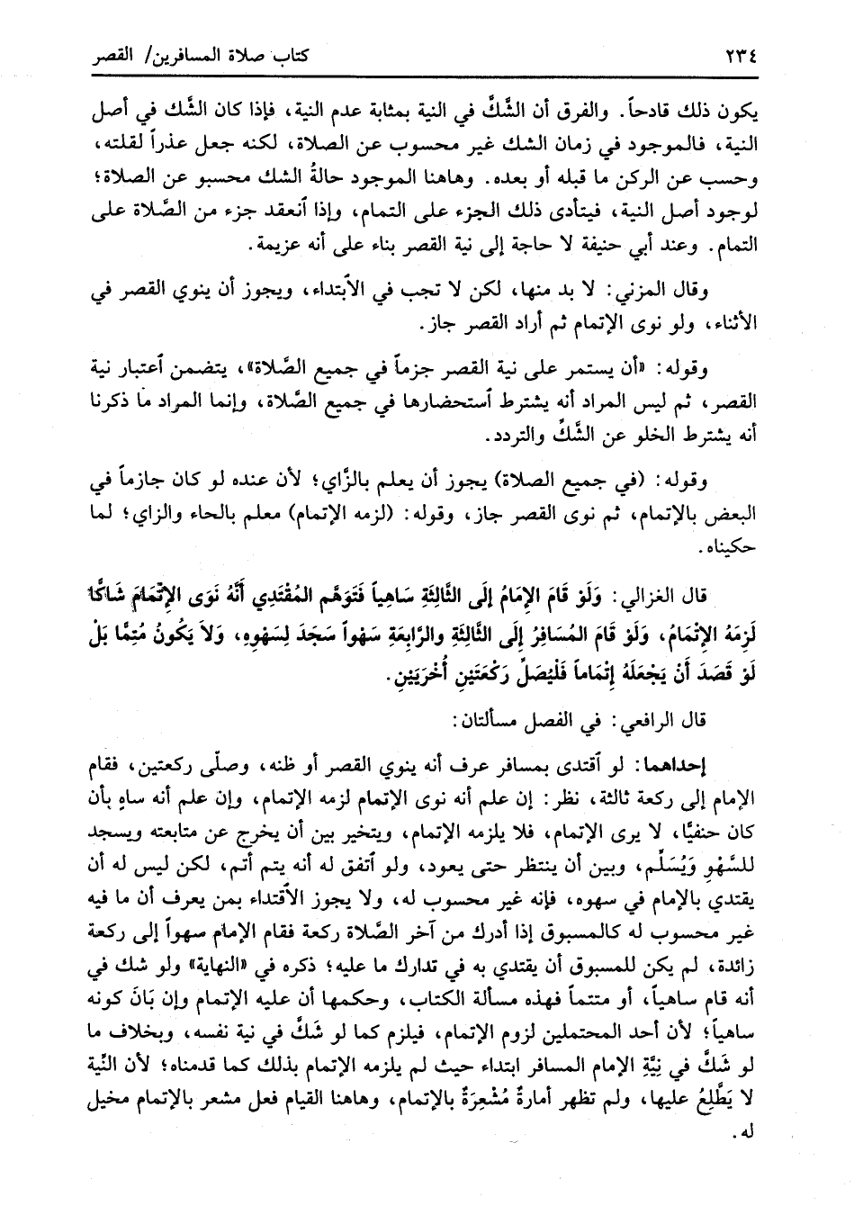 قال الغزالي: وَلَوْ قَامَ الإمَامُ إلَى الثَّالِثَةِ سَاهِياَ فَتَوَهَّم المُقْتَدِي أنَّهُ نَوَى الإتْمَامَ شَاكّاً لَزِمَهُ الإِتْمَامُ، وَلَوْ قامَ المُسَافِرُ إِلَى الثَّالِثَةِ والرَّابِعَةِ سَهْوًا سَجَدَ لِسَهْوِهِ، وَلاَ يَكُونُ مُتِمًّا بَلْ لَوْ قَصَدَ أَنْ يَجْعَلَهُ إِتْمَاماً فَلْيُصَلِّ رَكْعَتَيْنِ أُخْرَيَيْنِ.