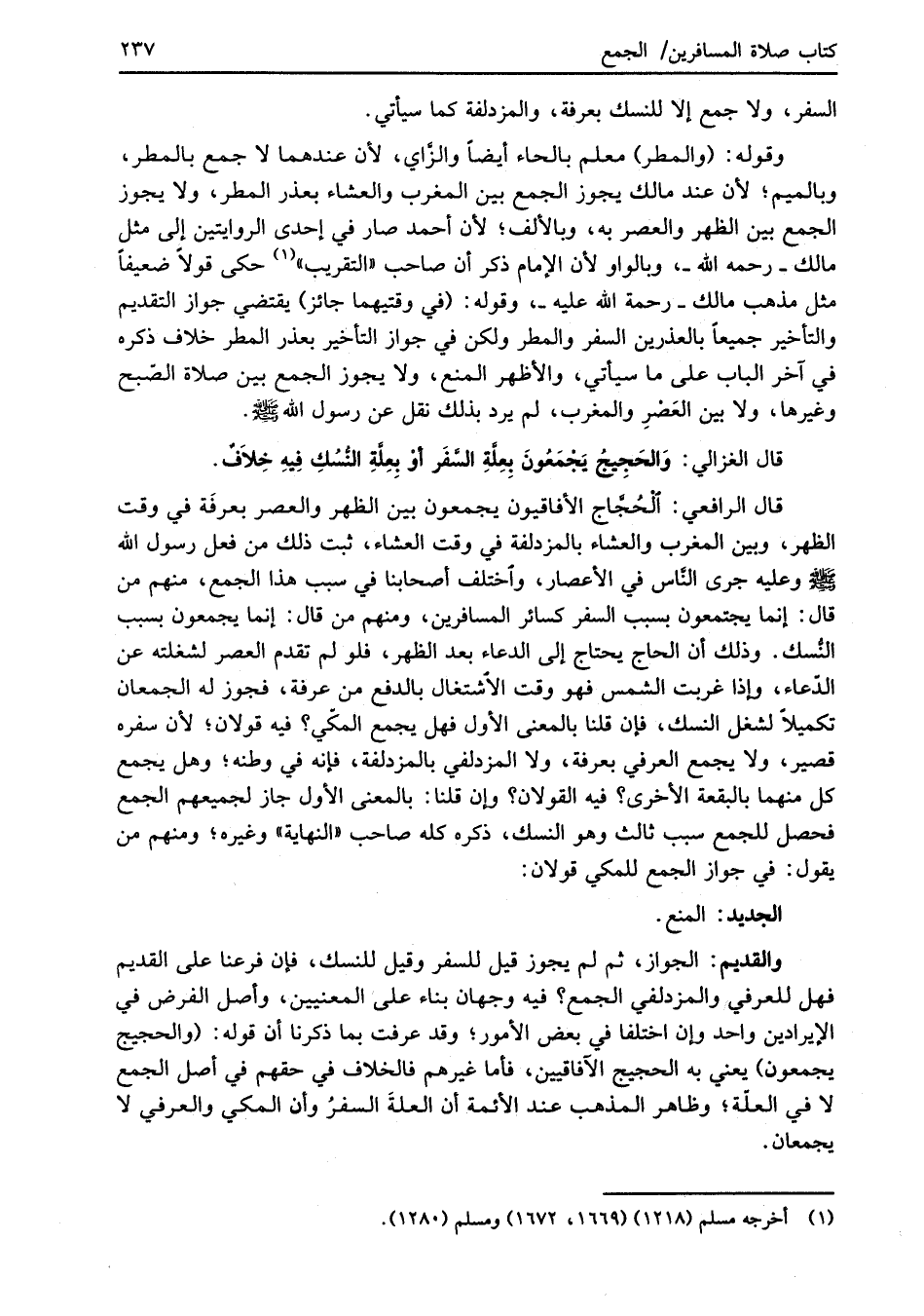 والقديم: الجواز، ثم لم يجوز قيل للسفر وقيل للنسك، فإن فرعنا على القديم فهل للعرفي والمزدلفي الجمع؟ فيه وجهان بناء على المعنيين، وأصل الفرض في الإيرادين واحد وإن اختلفا في بعض الأمور؛ وقد عرفت بما ذكرنا أن قوله: (والحجيج يجمعون) يعني به الحجيج الآفاقيين، فأما غيرهم فالخلاف في حقهم في أصل الجمع لا في العلّة؛ وظاهر المذهب عند الأئمة أن العلةَ السفرُ وأن المكي والعرفي لا يجمعان.