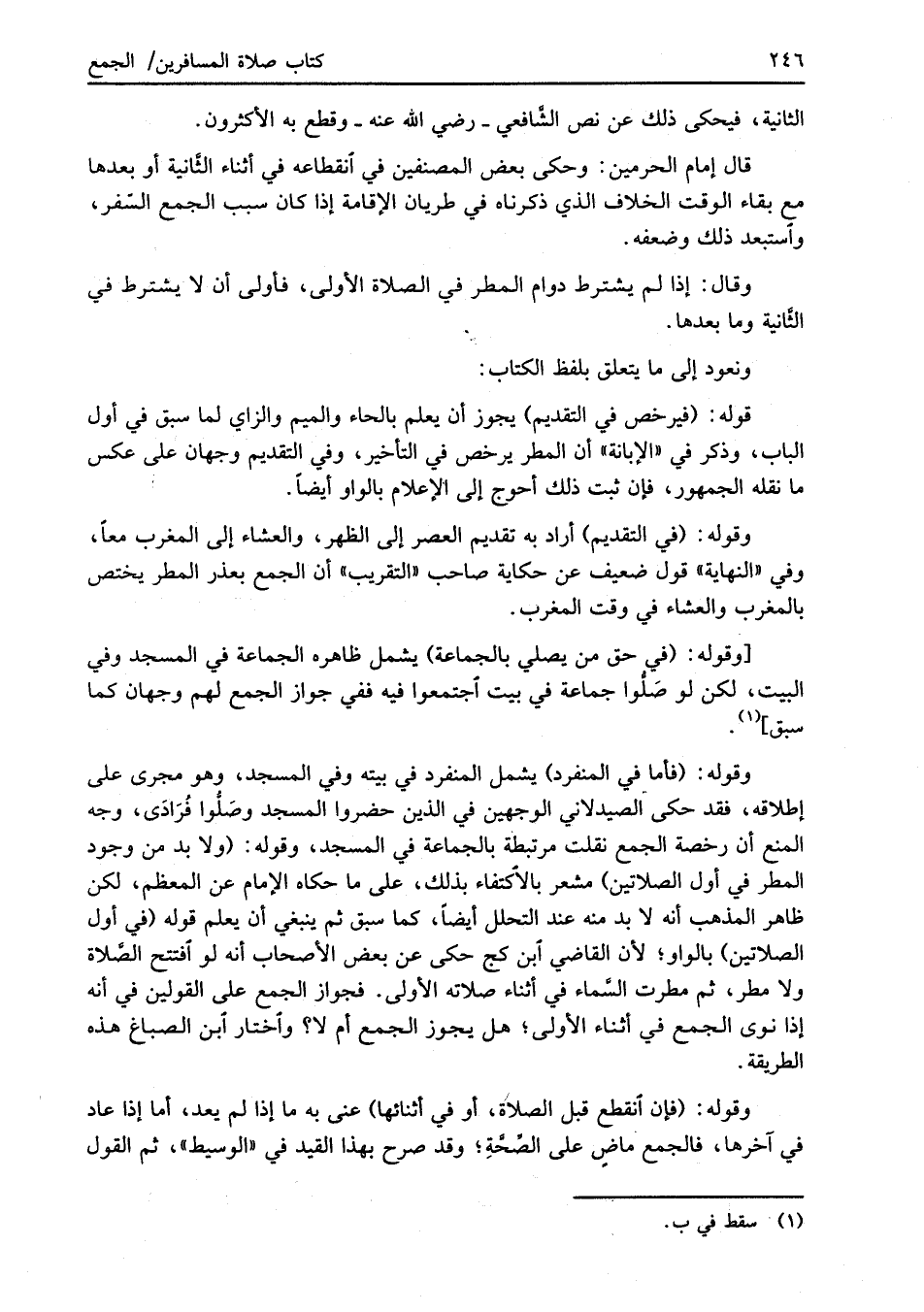 وقوله: (فأما في المنفرد) يشمل المنفرد في بيته وفي المسجد، وهو مجرى على إطلاقه، فقد حكى الصيدلاني الوجهين في الذين حضروا المسجد وصَلُّوا فُرَادَى، وجه المنع أن رخصة الجمع نقلت مرتبطة بالجماعة في المسجد، وقوله: (ولا بد من وجود المطر في أول الصلاتين) مشعر بالاكتفاء بذلك، على ما حكاه الإمام عن المعظم، لكن ظاهر المذهب أنه لا بد منه عند التحلل أيضاً، كما سبق ثم ينبغي أن يعلم قوله (في أول الصلاتين) بالواو؛ لأن القاضي ابن كج حكى عن بعض الأصحاب أنه لو افتتح الصَّلاة ولا مطر، ثم مطرت السَّماء في أثناء صلاته الأولى. فجواز الجمع على القولين في أنه إذا نوى الجمع في أثناء الأولى؛ هل يجوز الجمع أم لا؟ واختار ابن الصباغ هذه الطريقة.