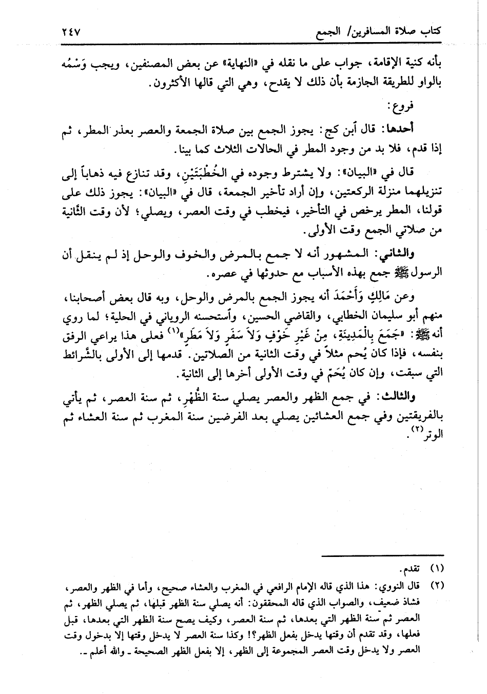 (¬2) قال النووي: هذا الذي قاله الإمام الرافعي في المغرب والعشاء صحح، وأما في الظهر والعصر، فشاذ ضعيف، والصواب الذي قاله المحققون: أنه يصلي سنة الظهر قبلها، ثم يصلي الظهر، ثم العصر ثم سنة الظهر التي بعدها، ثم سنة العصر، وكيف يصح سنة الظهر التي بعدها، قبل فعلها، وقد تقدم أن وقتها يدخل بفعل الظهر؟! وكذا سنة العصر لا يدخل وقتها إلا بدخول وقت العصر ولا يدخل وقت العصر المجموعة إلى الظهر، إلا بفعل الظهر الصحيحة -والله أعلم-.