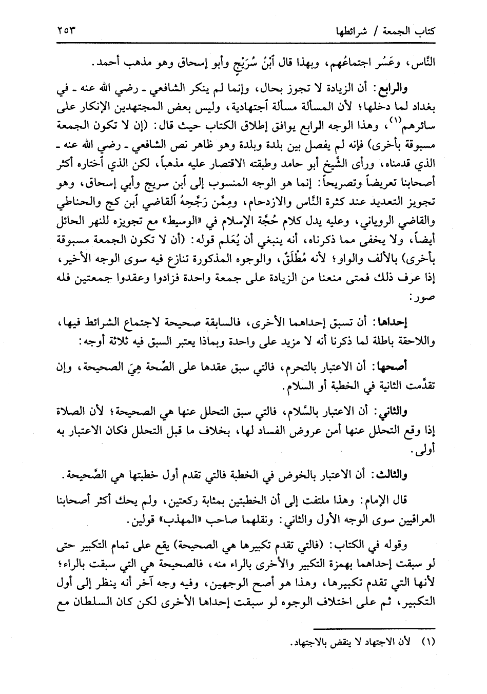 والرابع: أن الزيادة لا تجوز بحال، وإنما لم ينكر الشافعي -رضي الله عنه- في بغداد لما دخلها؛ لأن المسألة مسألة اجتهادية، وليس بعض المجتهدين الإنكار على سائرهم (¬1)، وهذا الوجه الرابع يوافق إطلاق الكتاب حيث قال: (إن لا تكون الجمعة مسبوقة بأخرى) فإنه لم يفصل بين بلدة وبلدة وهو ظاهر نص الشافعي -رضي الله عنه- الذي قدمناه، ورأى الشَّيخ أبو حامد وطبقته الاقتصار عليه مذهباً، لكن الذي اختاره أكثر أصحابنا تعريضاً وتصريحاً: إنما هو الوجه المنسوب إلى ابن سريج وأبي إسحاق، وهو تجويز التعديد عند كثرة النَّاس والازدحام، ومِمَّن رَجَّحِهُ القاضي ابن كج والحناطي والقاضي الروياني، وعليه يدل كلام حُجَّة الإسلام في "الوسيط" مع تجويزه للنهر الحائل أيضاً، ولا يخفى مما ذكرناه، أنه ينبغي أن يُعَلم قوله: (أن لا تكون الجمعة مسبوقة بأخرى) بالألف والواو؛ لأنه مُطْلَقٌ، والوجوه المذكورة تنازع فيه سوى الوجه الأخير، إذا عرف ذلك فمتى منعنا من الزيادة على جمعة واحدة فزادوا وعقدوا جمعتين فله صور: